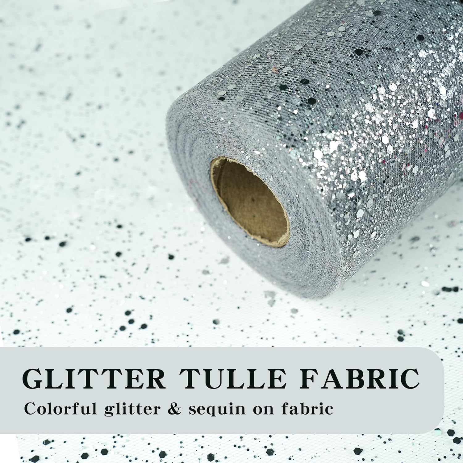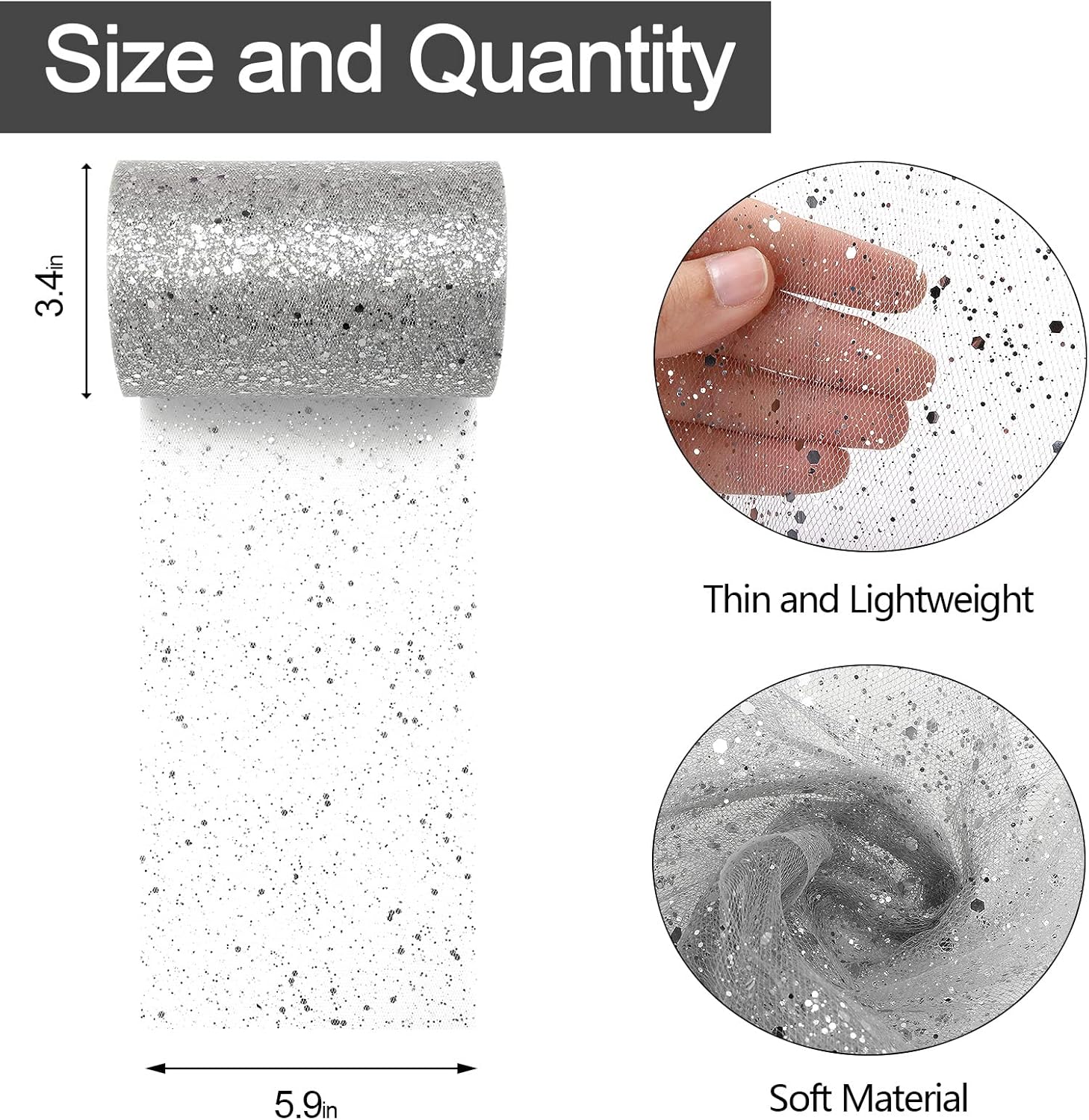 Glitter Tulle Rolls, 6” by 50 Yards (150FT) Sparkling Tulle Spool Ribbon Sequin Tulle Netting Fabric for Tutu Skirt Wedding Birthday Baby Shower (Silver)