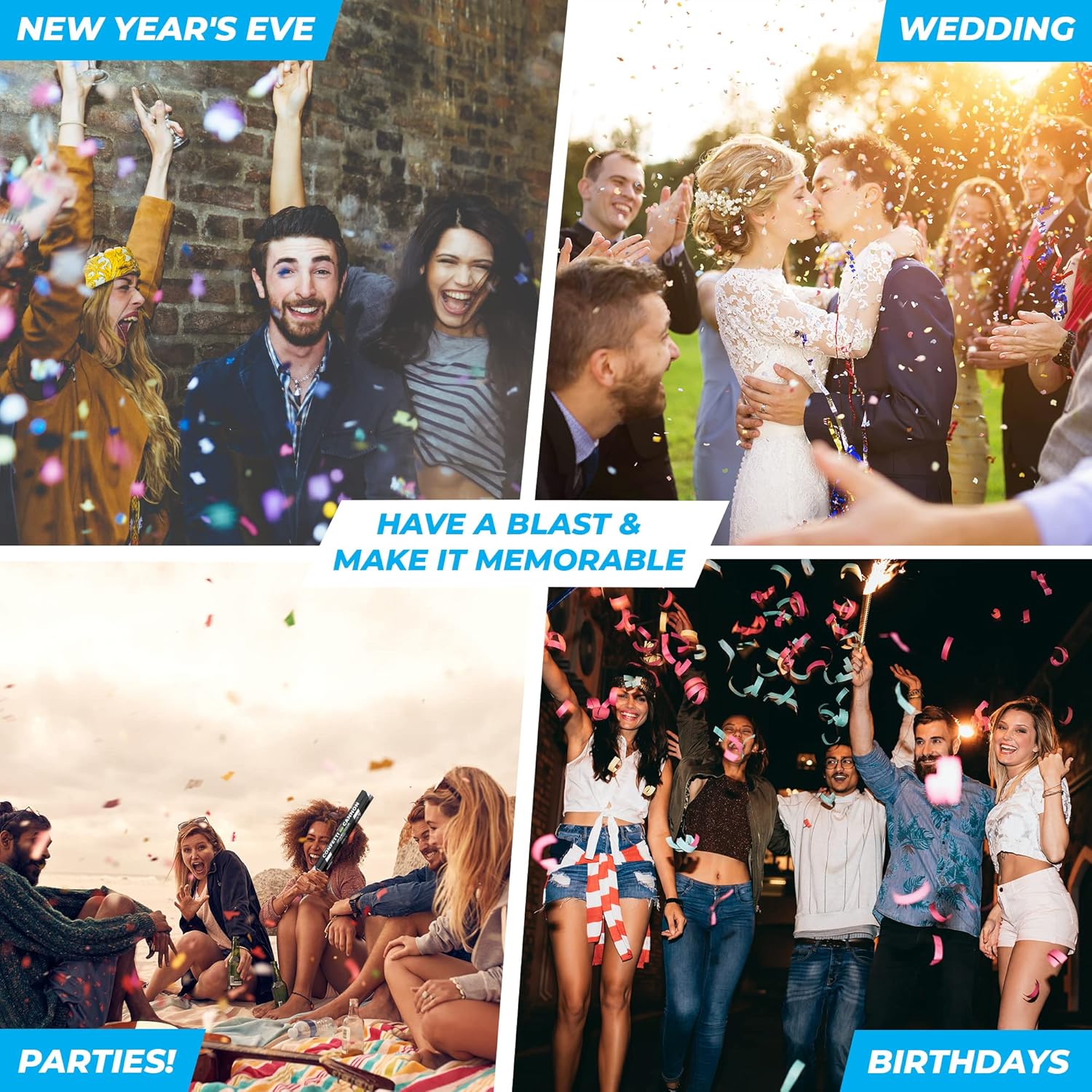 - π EASY POINT & TWIST ACTION - Don't need the strongest arms to blow up these babies! Point upwards away from people and twist to shoot, Biodegradable Silver confetti paper is loaded on top of compressed air and is launched by twisting the cannon. Operation manual is included inside the box.