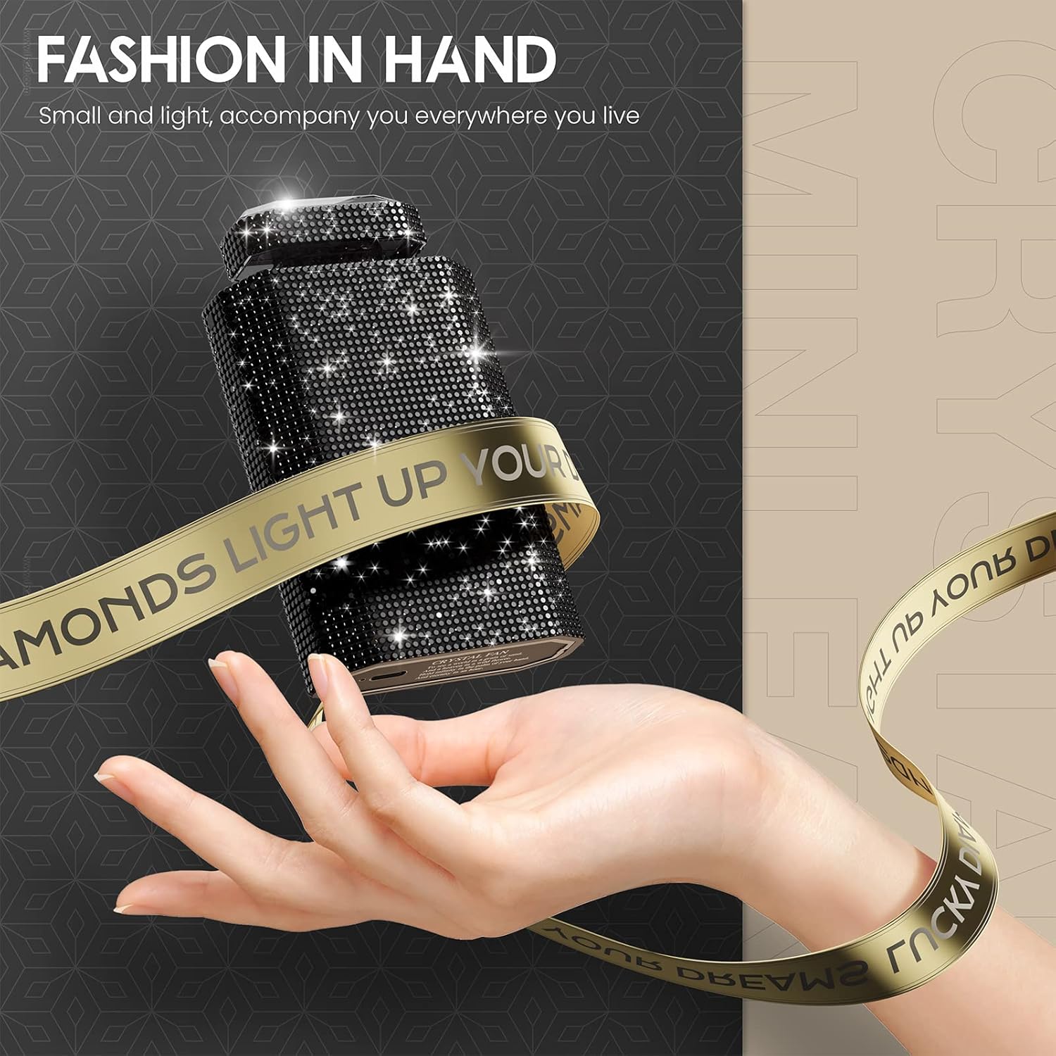 Lady Rechargeable Personal Fan with 3 Speeds, Quiet Portable Mini Cooling Desk Fan - Safe for Girls & Women - Black Rhinestones