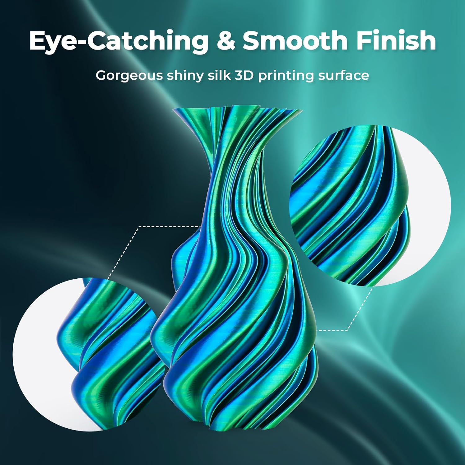 - Eye-catching Silk PLA: Shiny blue and green combination of magic 1.75mm PLA filament, make the two sides of your print appear in different colors. Without polishing, you can get a silk glossy and smooth 3d prints. Beginner & expert friendly, it’s your go-to for eye-catching designs all year round