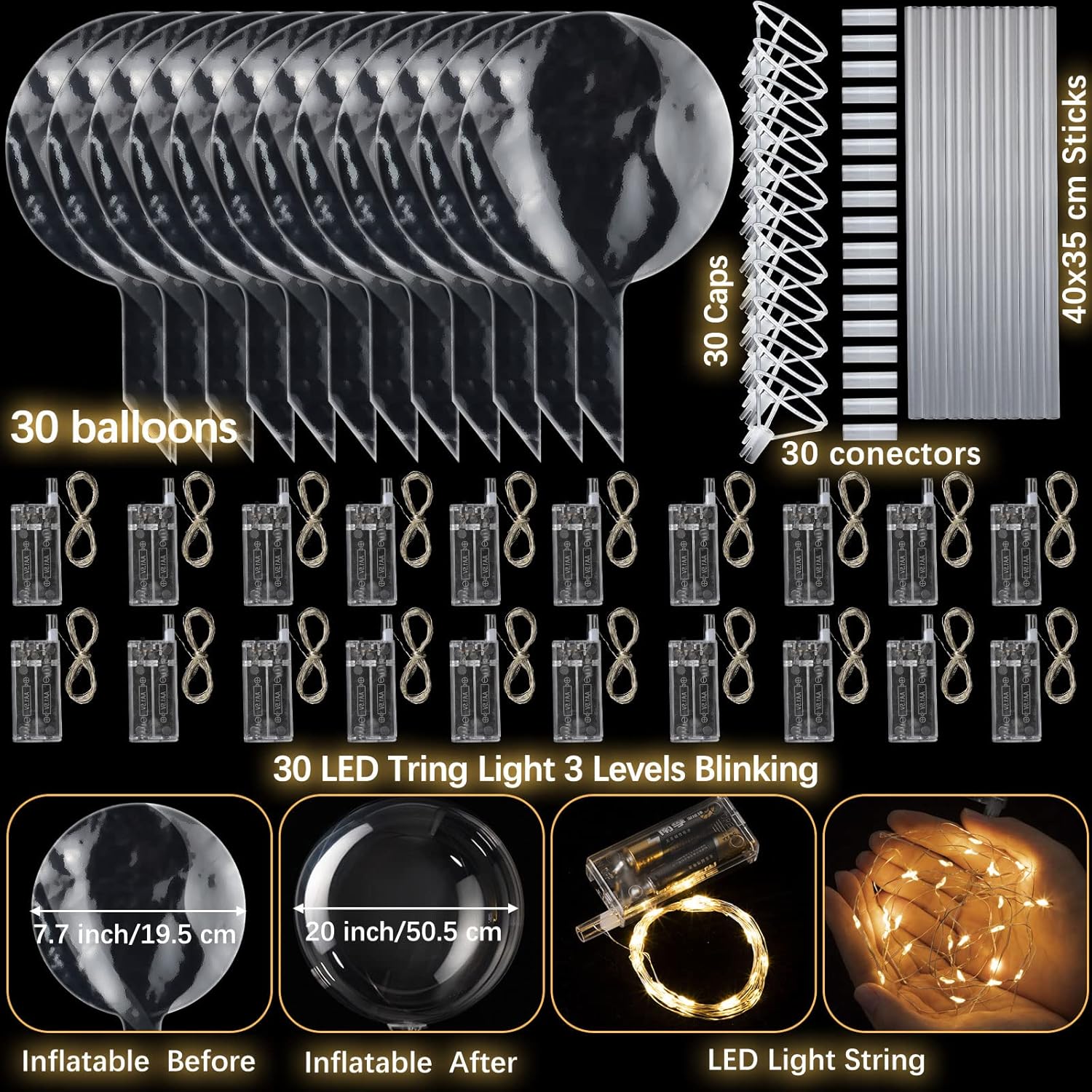 - Package Included: 30 pieces glow bobo balloons, 30 pieces led strings light (118 inch/ 3 meter for each), 60 pieces sticks (13.8 inch/ 35cm), a must have for a touch of fun and glamour, the highlight of your parties