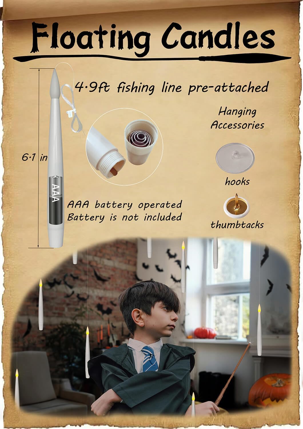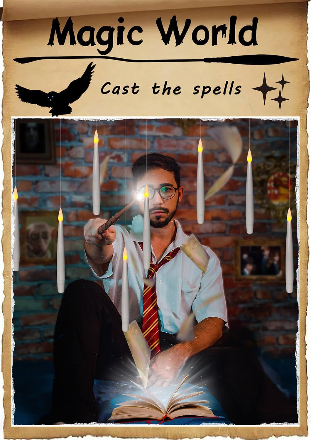 - Indoor decorations: The LED candle flickers with warm white light. You can hang these candles on the ceiling or chandelier to create "floating" candles effect for a Movie Theme party. They work great for dinner table, room, bedroom, classroom, nursery, birthday party, wedding. Also a perfect gift for Halloween Christmas and valentine's day.