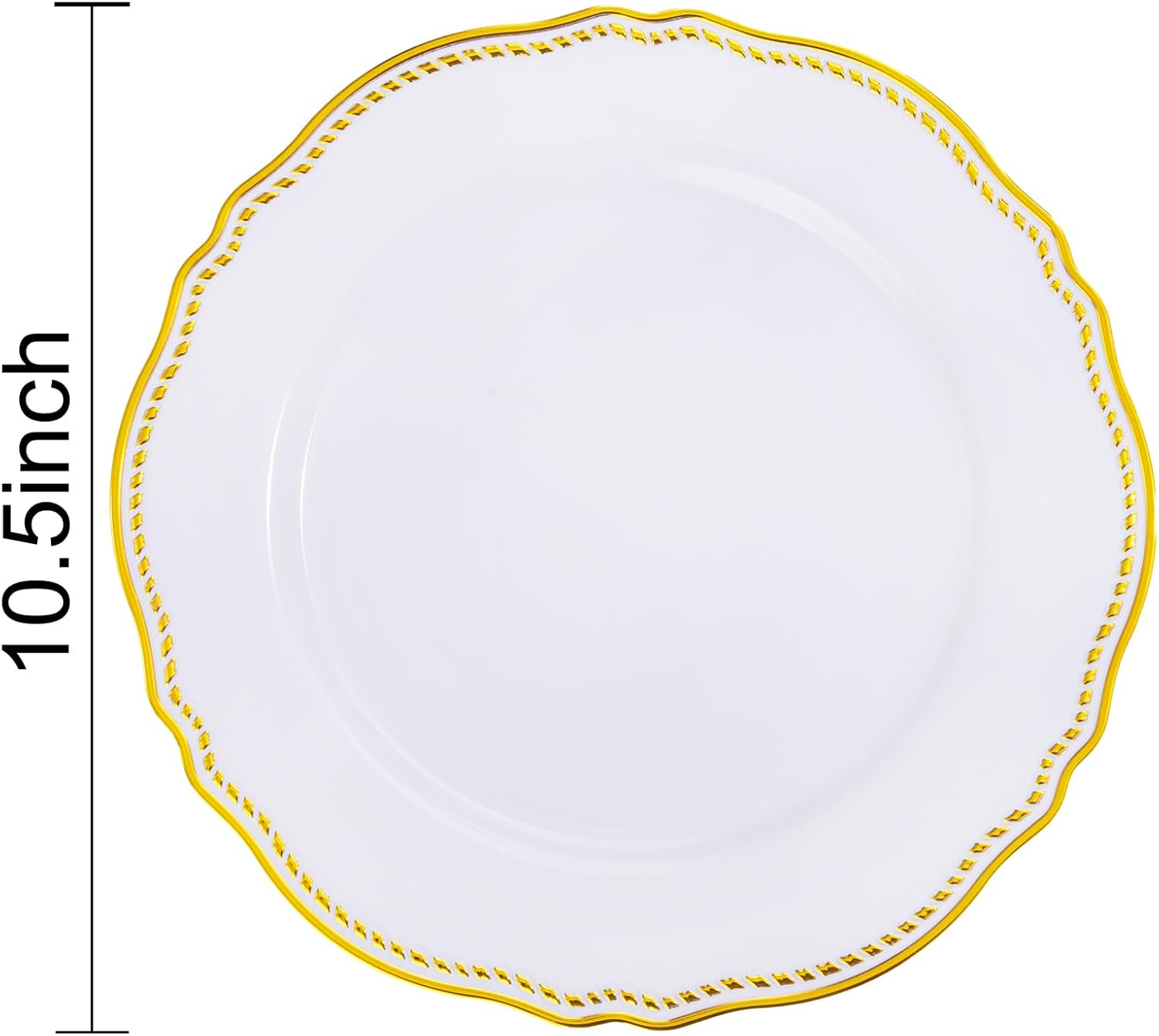 - Equisite Design - These white and gold disposable plates have a elegant vintage design and handled by strictly quality control, makes the plastic plates are much stronger than regular ones. The gold plastic plates are matching fancy tableware together cups and napkins, in order to make your guest get satisfied