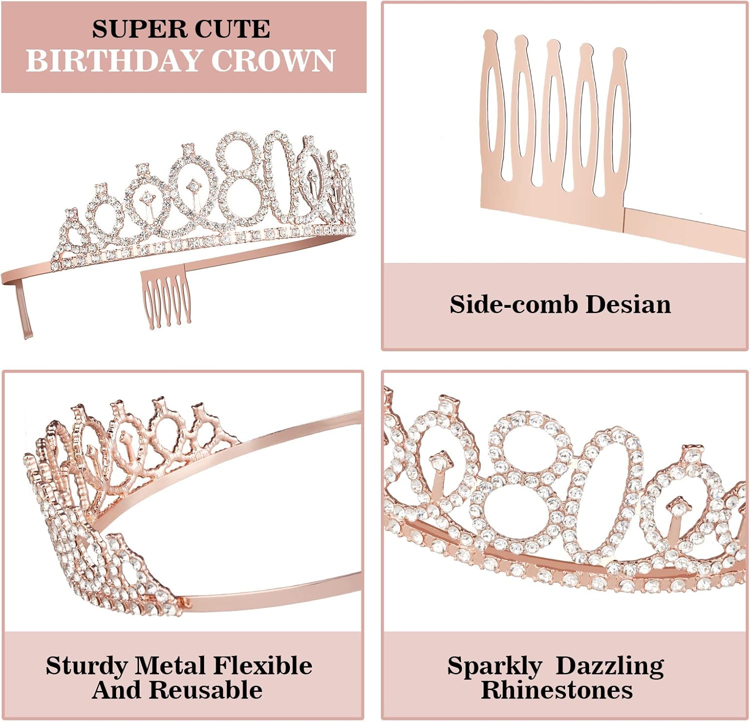 - 80th Birthday Crown for Women: Made of high quality alloy and rhinestone. Rose gold 80th birthday tiara with combs that make sure it can grip the hair more tightly for fitting women. Dimension: 5.12β on the front side