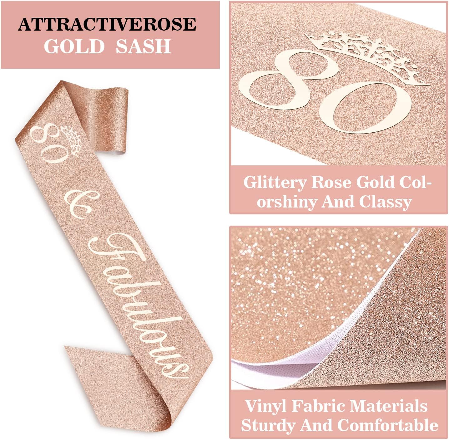- 80th Birthday Sash for Women: Our 80th birthday sash is made of high quality glitter fabirc with foil lettering. The sash is in 63 inch length and comes with a gold charm pin that you can easily adjust the length you need