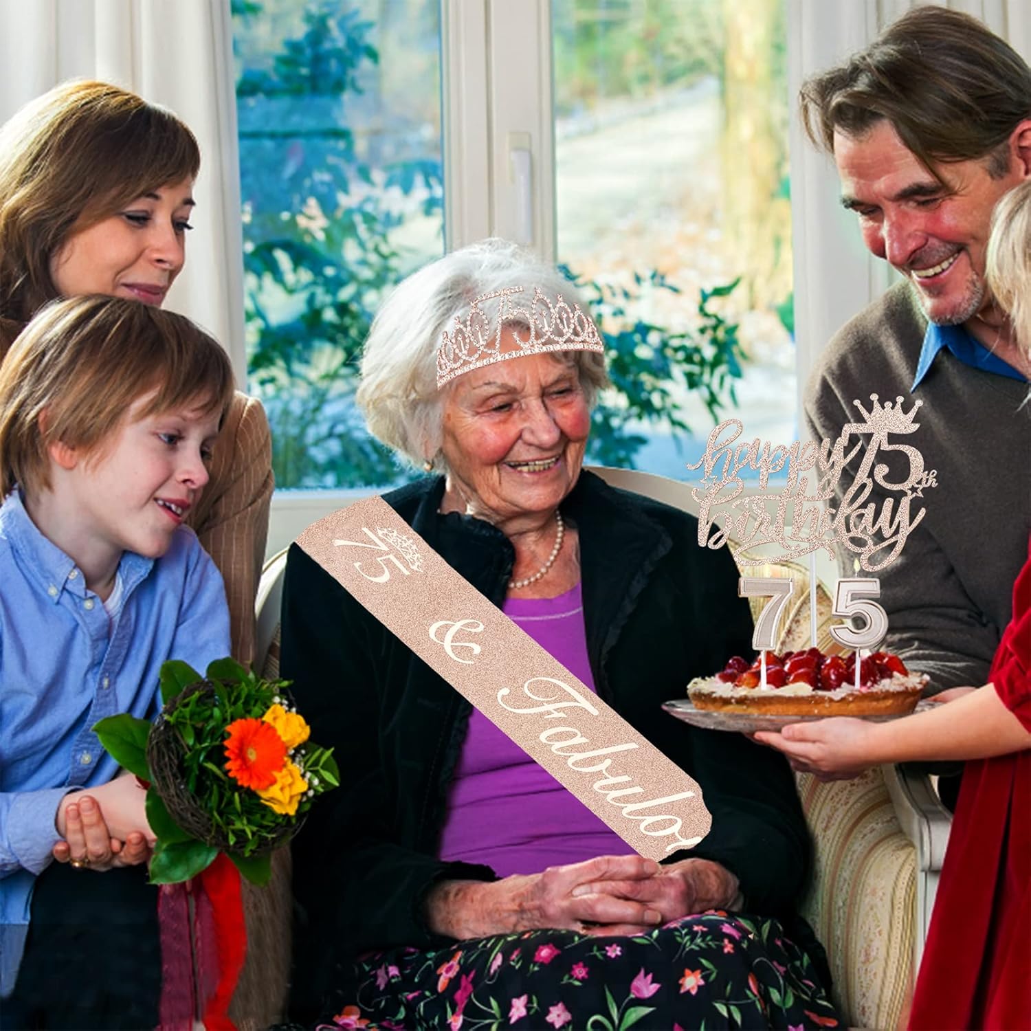 75th Birthday Decorations for Women Including Sash, Crown/Tiara, Candles and Cake Topper, Rose Gold 75 Birthday Gifts Party Favor Supplies