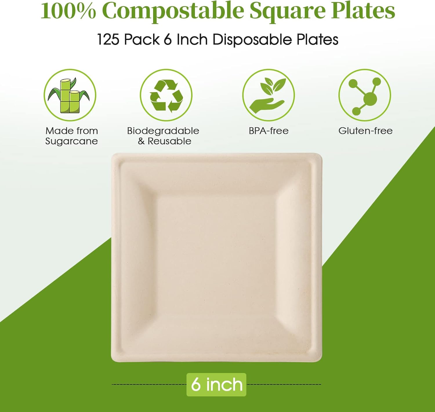 - 6-inch Sugarcane Plates: Set includes 125 Pack 100% compostable 6 inch heavy-duty square paper plates, The bagasse plate can be matched with any food, perfect for serving sandwiches, burgers, pasta, salads, baked beans, french fries, fruits