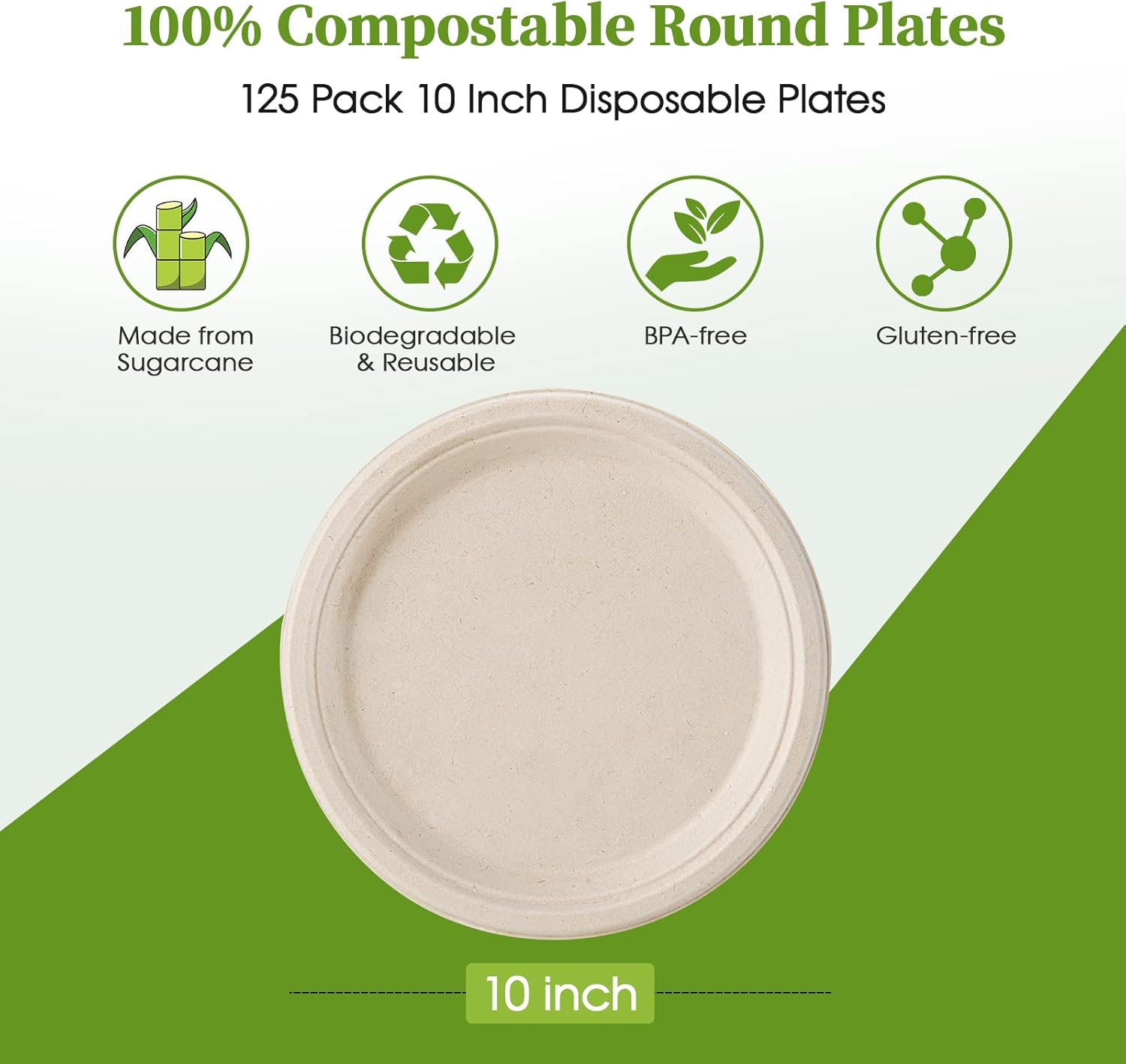 - 10 inch Plates: We have 125 pieces of 10 inch disposable paper plates in the pack. The simple and atmospheric sugar cane plate can be matched with any food, perfect for serving sandwiches, burgers, pasta, salads, baked beans, french fries, fruits