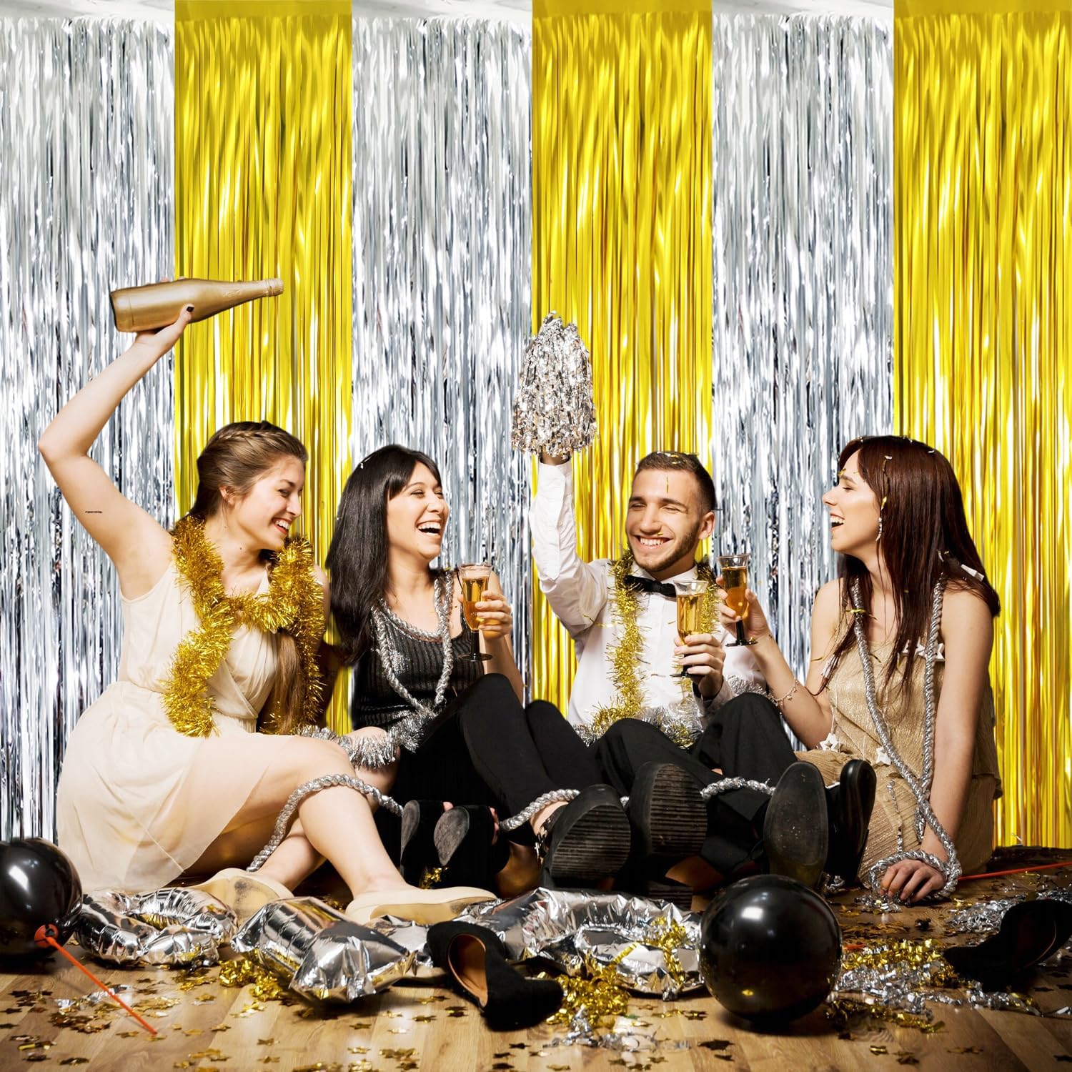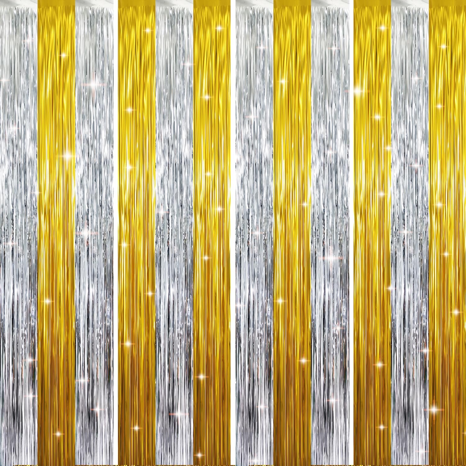 - Package Includes:4 pack Gold&Silver foil fringe curtains,3.2 ft x 8.2 ft each,suitable for hanging on a door or coverage a wall fully