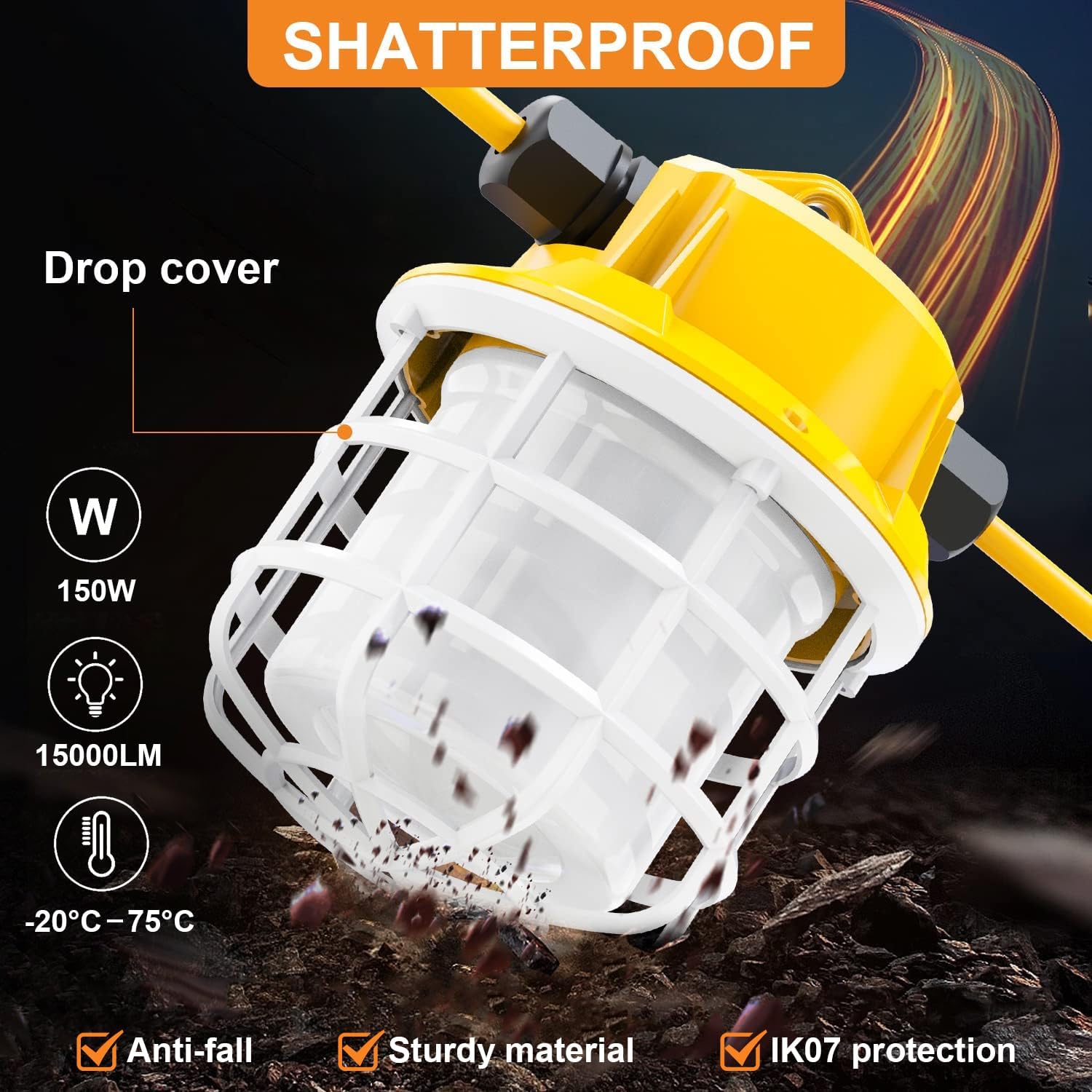 100ft LED Construction String Lights, 150W 15000LM Super Bright LED String Work Light, Construction Temporary Lights Apply to Renovation, Courtyard, Jobsite, and All Outdoor Lighting (100ft-10lights)