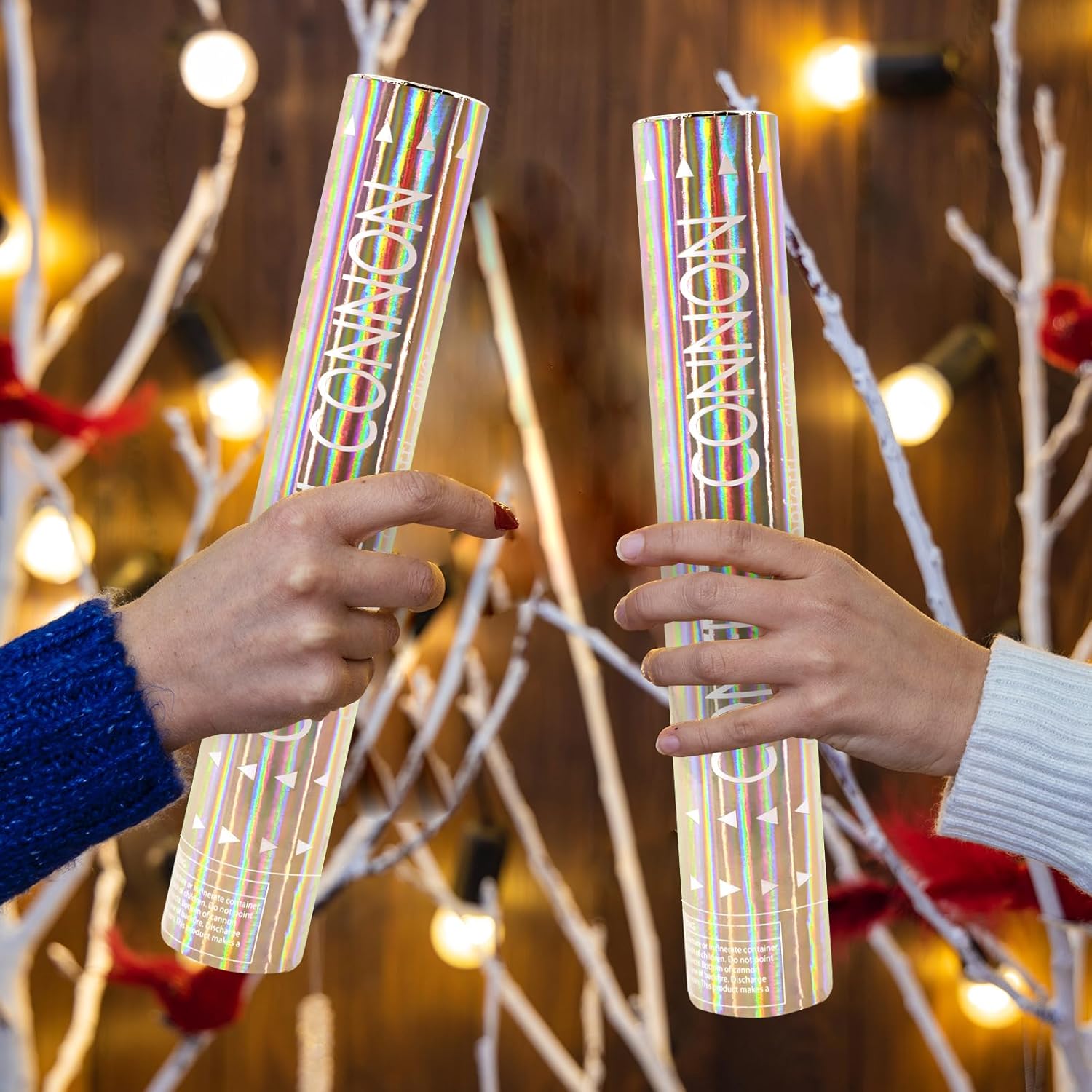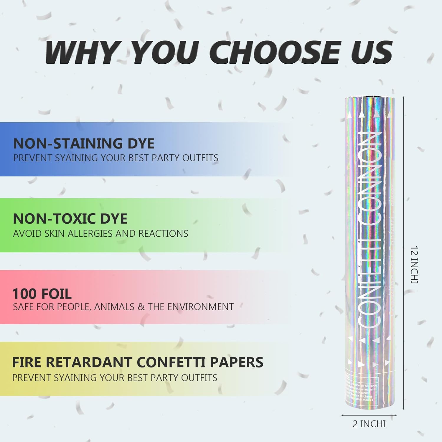 - CONFETTI CANNON FEATURES:Our confetti cannons come with a 12-pack of stunning silver poppers, each designed to unleash a beautiful shower of shiny silver confetti upon twisting. For an optimal experience, make sure to read the instructions carefully and peel off the packaging paper at the bottom of the popper