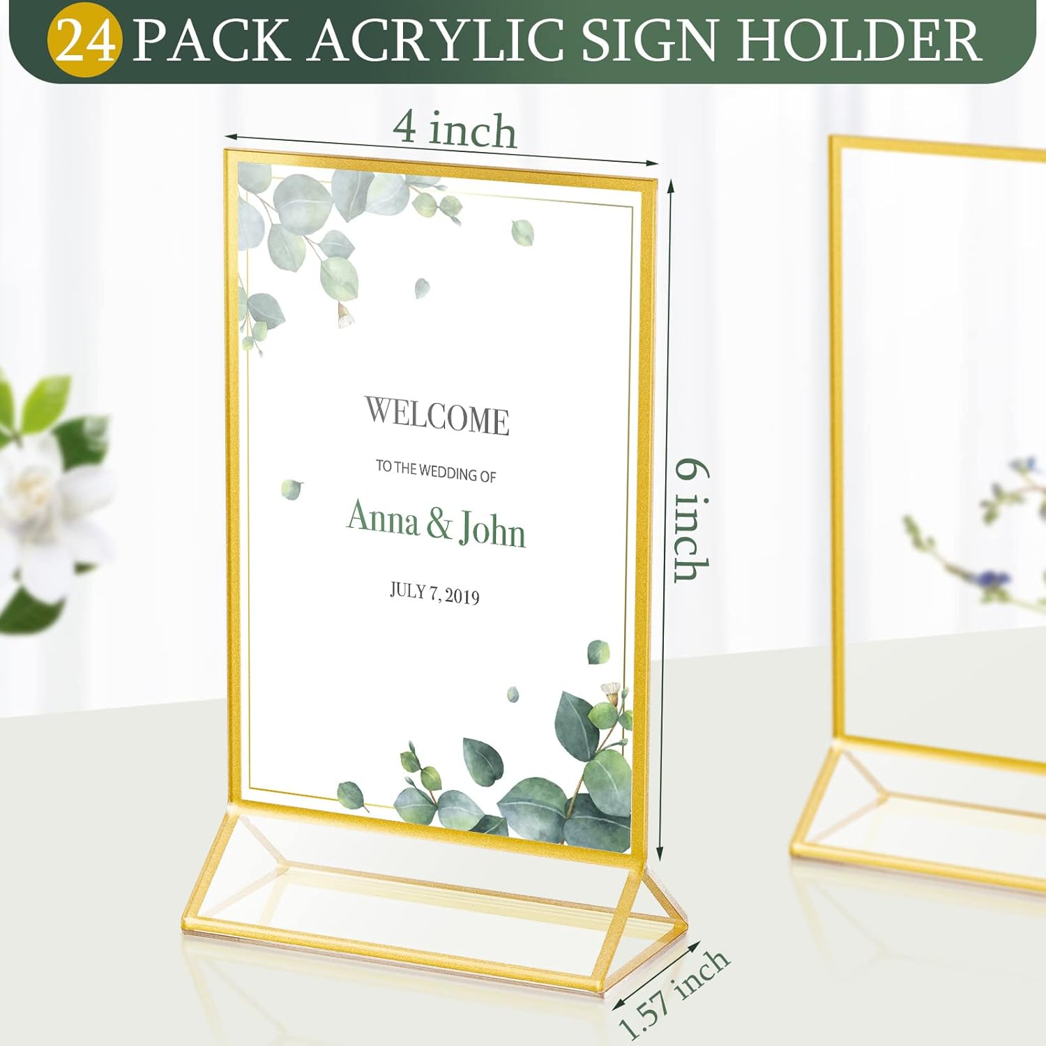 24 Pack Gold Picture Frames 4 x 6 Inch Clear Acrylic Sign Holders Double Sided Display Frames Bulk with Stand 2 mm Gold Border for Table Numbers Wedding Party (Vertical)
