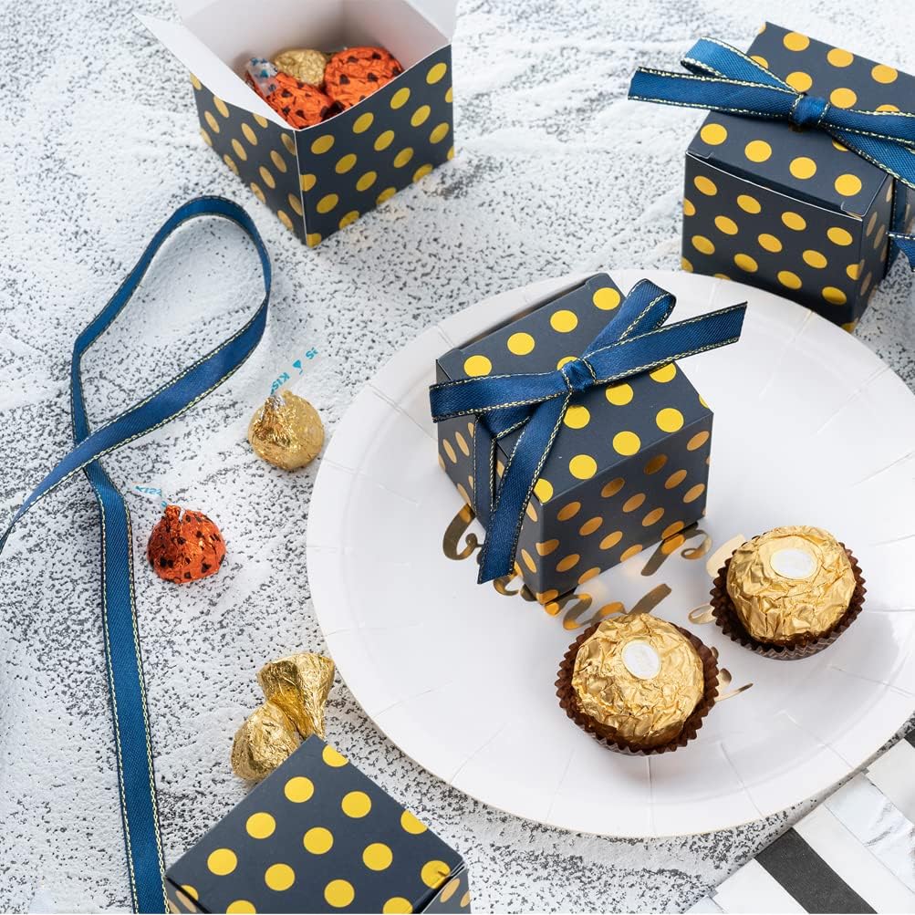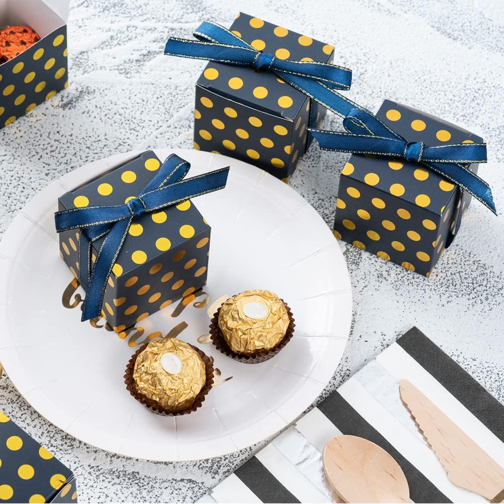 Navy Blue Gift Candy Box with Gold Dots Bulk 2x2x2 inches with Ribbon Party Favor Box for Birthday Graduation Party, Gold Dots,Pack of 50