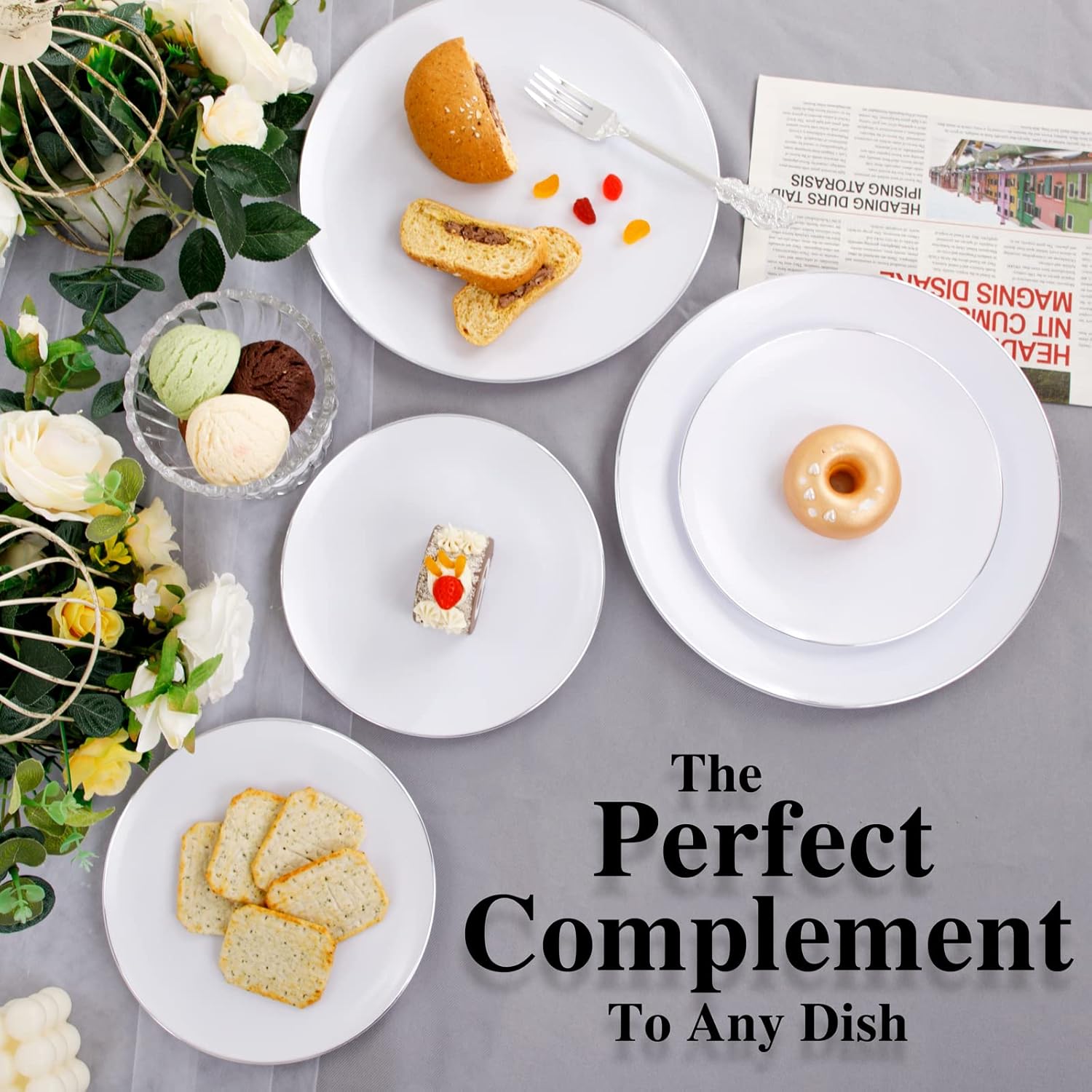 KIRE 100PCS Silver Plastic Plates - Heavy Duty White Disposable Plates with Silver Rim for Party/Wedding - Include 50Pcs 10.25inch Dinner Plates and 50Pcs 7.5inch Dessert Plates for Christmas