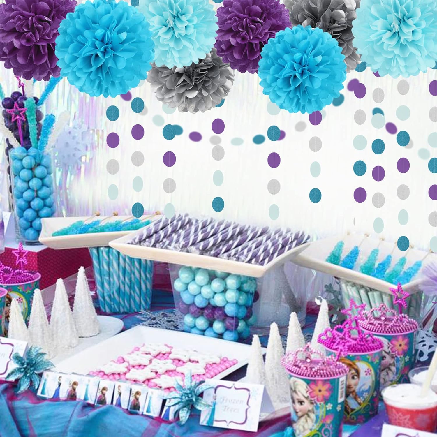 Purple-Blue Silver Frozen Christmas Party-Decorations - 30pcs Tissue Pom Poms Streamers,Winter Girl Birthday New Year Tassel Garland Banner,Wonderland Mermaid Baby Shower Wedding Supplies Decor Bunting Lasting Surprise