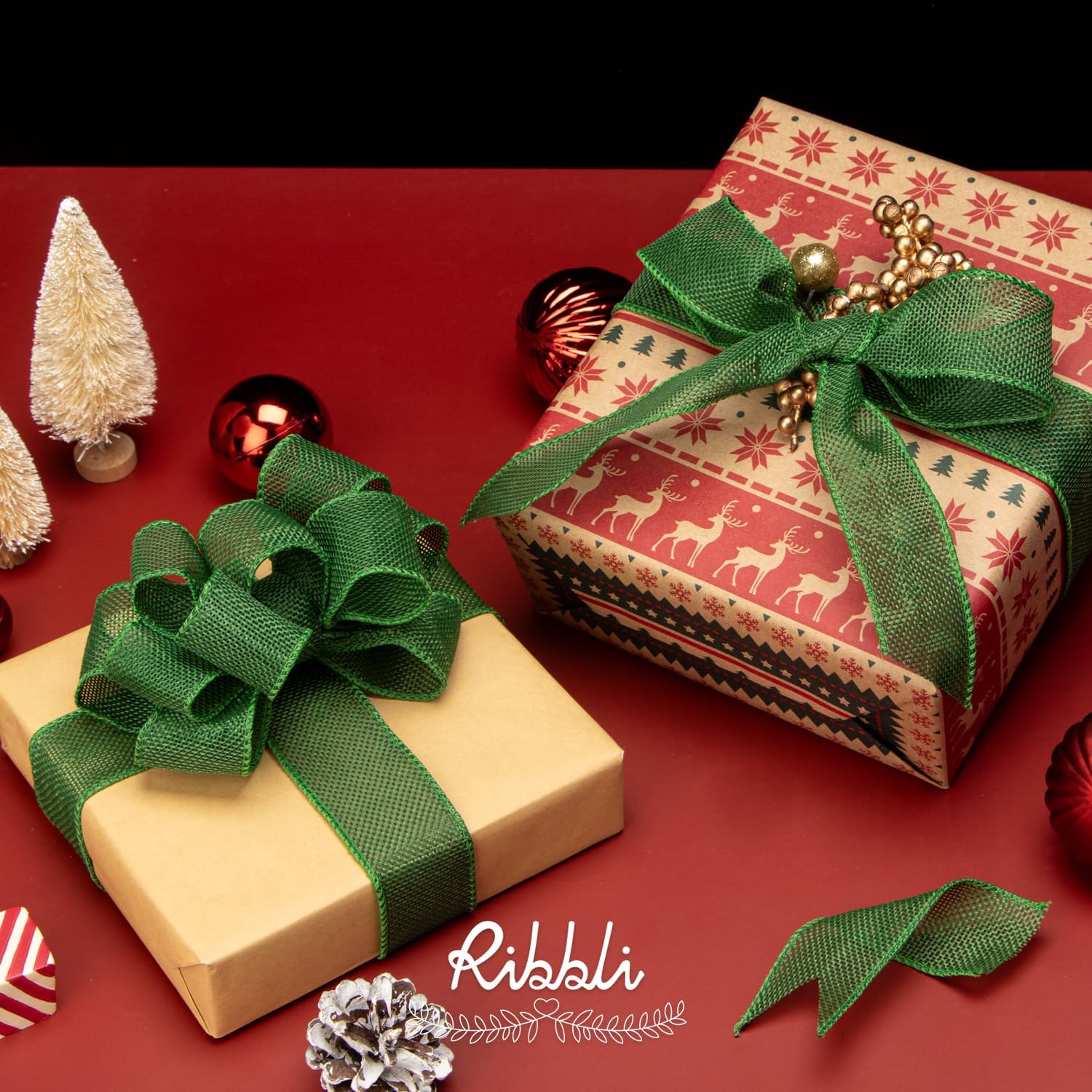 Ribbli Emerald Green Burlap Wired Ribbon, 1-1/2” Inch x Continuous 20 Yard, Green Wired Ribbon for Wreaths,Big Bows,Tree Decoration,Outdoor Decoration