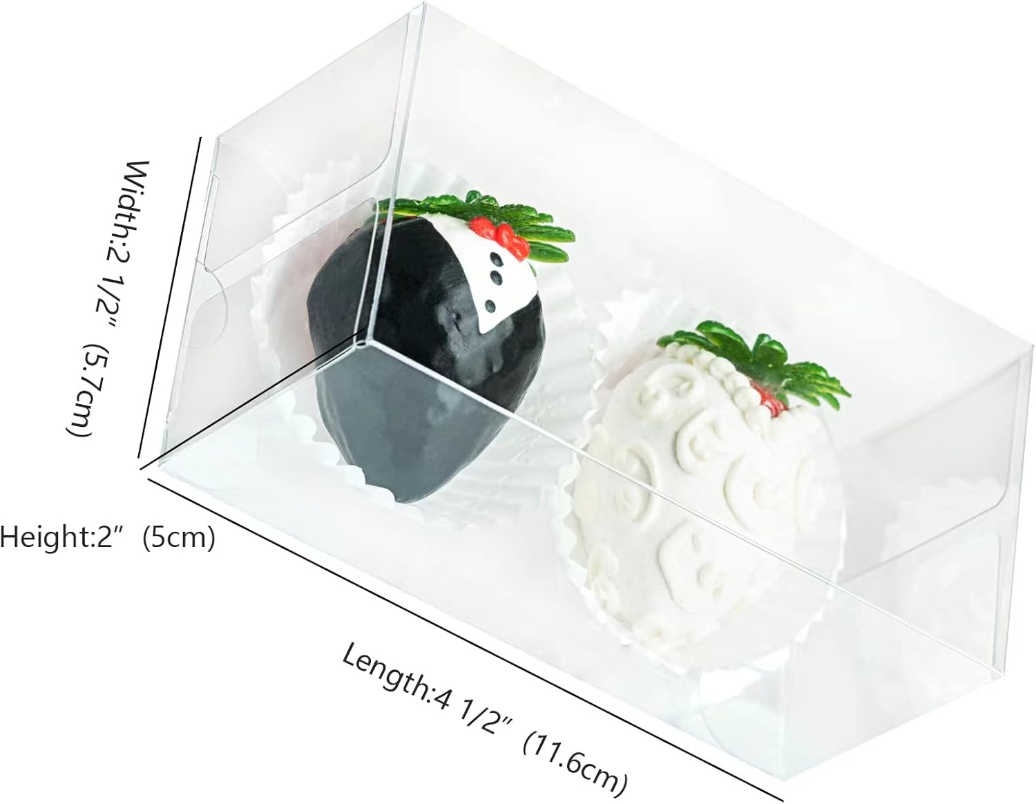 - 【Quantity;Size】100 pack boxes only(not include chocolate covered strawberries),bakery plastic boxes Length: 4 1/2 inchesonly (11.5CM) x Width: 2 1/4inches(5.7CM) x Height: 2 inches(5CM)