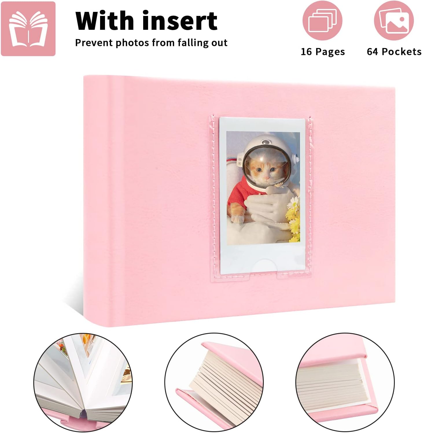 64 Pocket Mini Photo Album with Writing Space,Faux Leather Cover, Compatible with 2x3 Inch Polaroid Pictures and Fujifilm Instax Mini 12 11 9 99 8 7+ 40 Evo Instant Film (Pink)