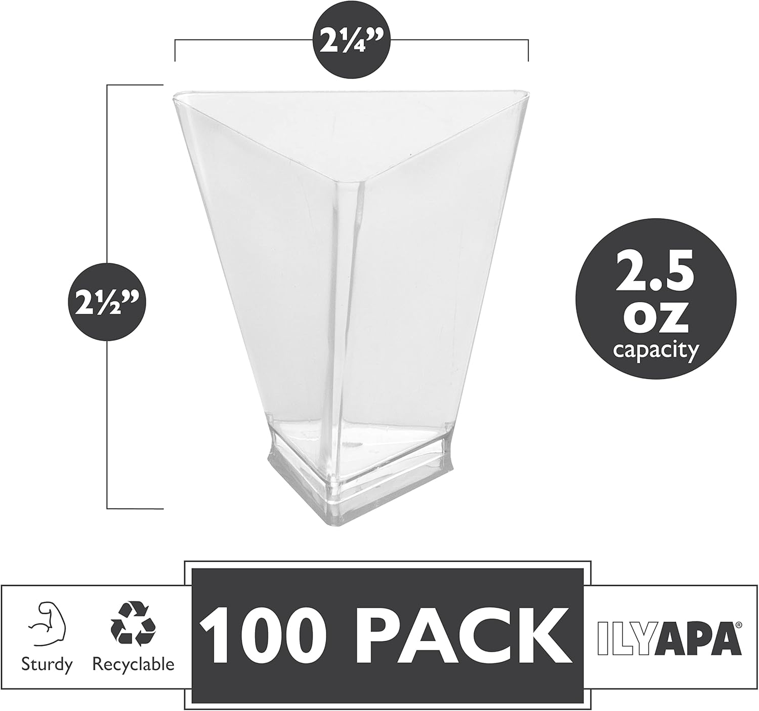 - Enhance any Occassion - With these stylish and premium dessert shooter cups! These 3oz triangle plastic serving cups come with 100 spoons, everything you need to serve 100 guests. These small desert cups are perfect for breakfast, brunch, appetizers, and more!