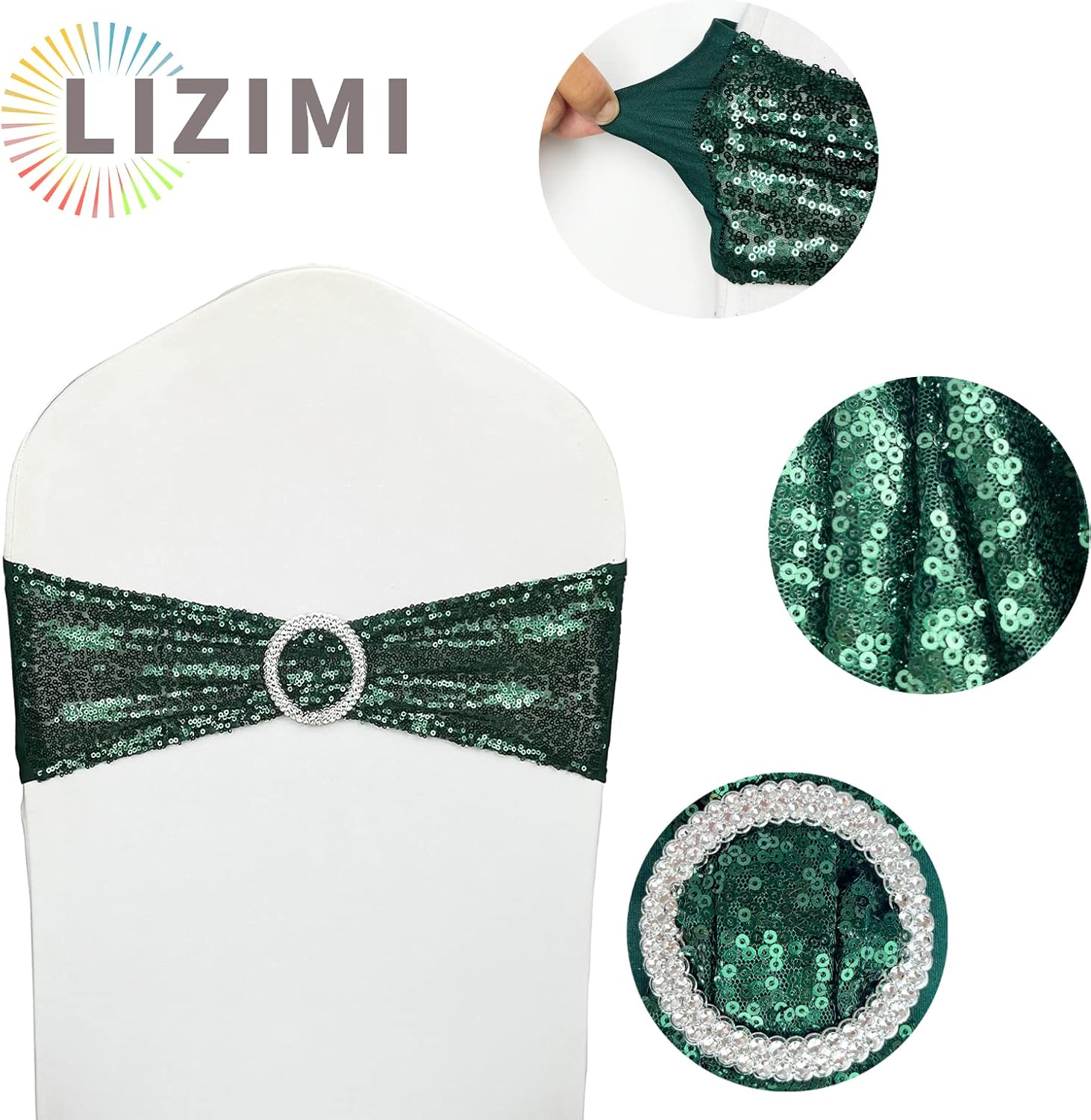 Chair Sashes Sequin Stretch Chair Bands Dark Green Spandex Polyester Bows for Party Hotel Wedding Banquets Decoration - 6 Pcs Hunter Emerald Green