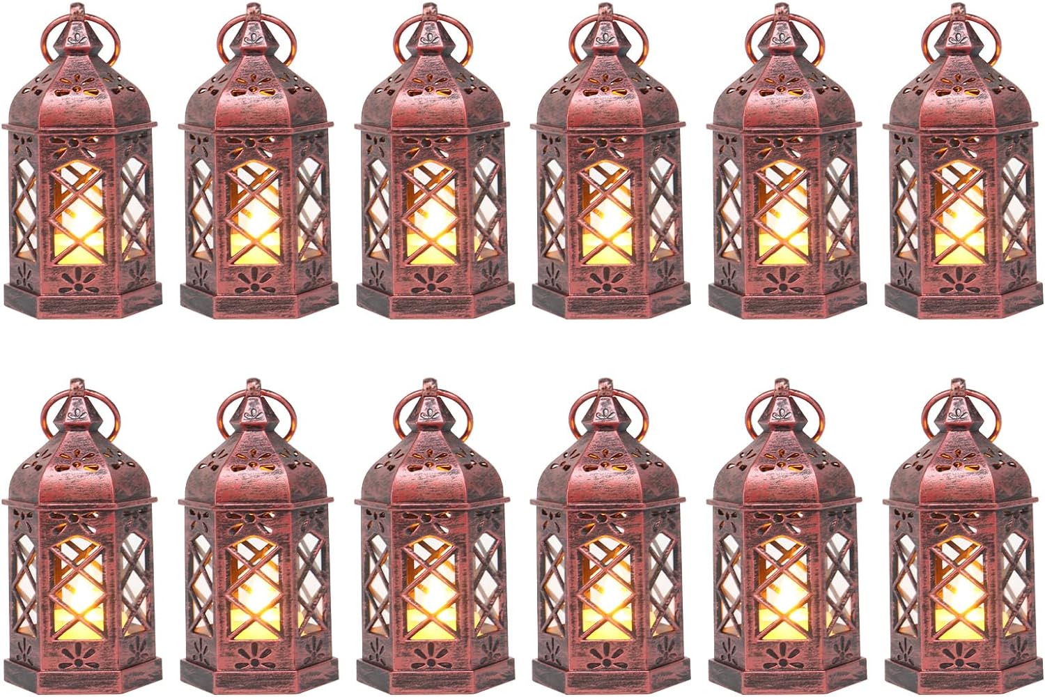 12PCS Mini Lantern with Flicker LED Candle for Halloween Decorations, Small Lanterns Decorative, Vintage Hanging Moroccan Lantern for Wedding Halloween Christmas Decor, Table Centerpiece, Rose Gold