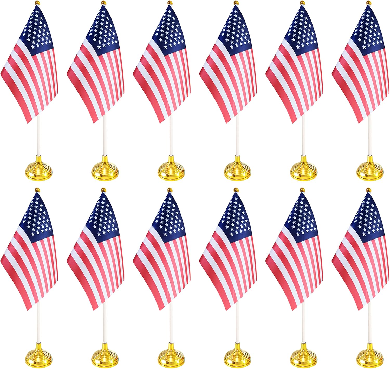 12 Pack USA US Desk Flags,Small Mini American Deluxe Table Flags Set with Stand Base,8.2 x 5.5 inches Miniature Desktop Flag