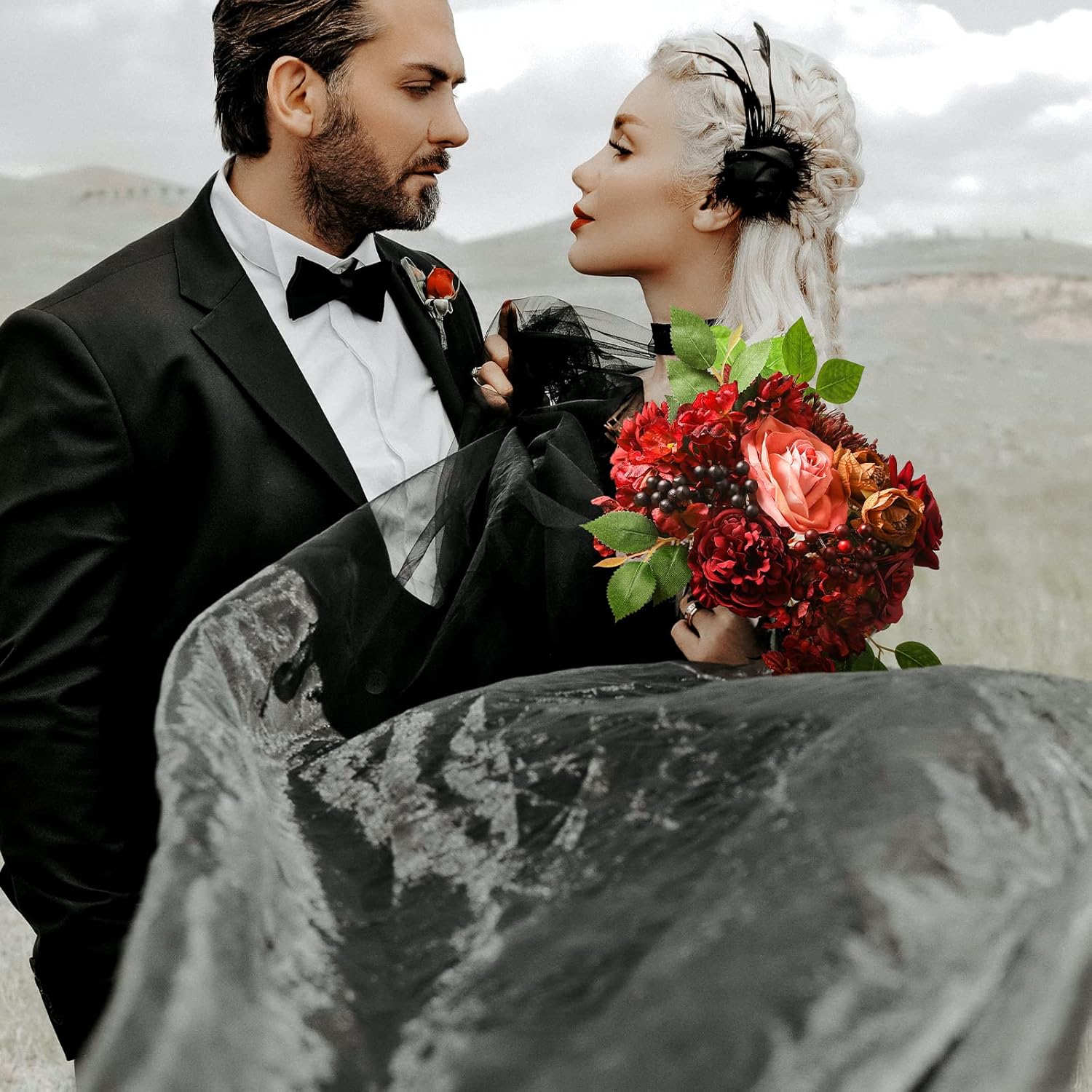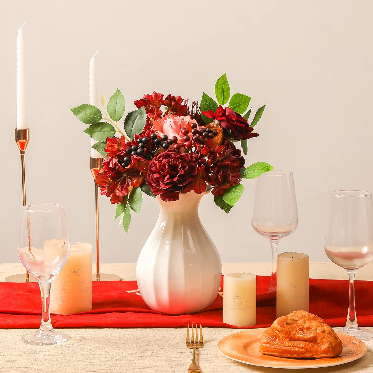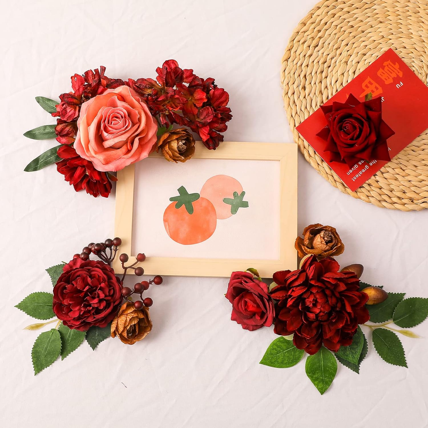 - GREAT VALUE COMBO PACK:Our artificial burgundy flowers combo never wilt. This is a combo pack of different styles of flowers and plastic greenery leavesThey look not only beautiful but very lifelike, perfect for creating romantic and warm atmosphere.