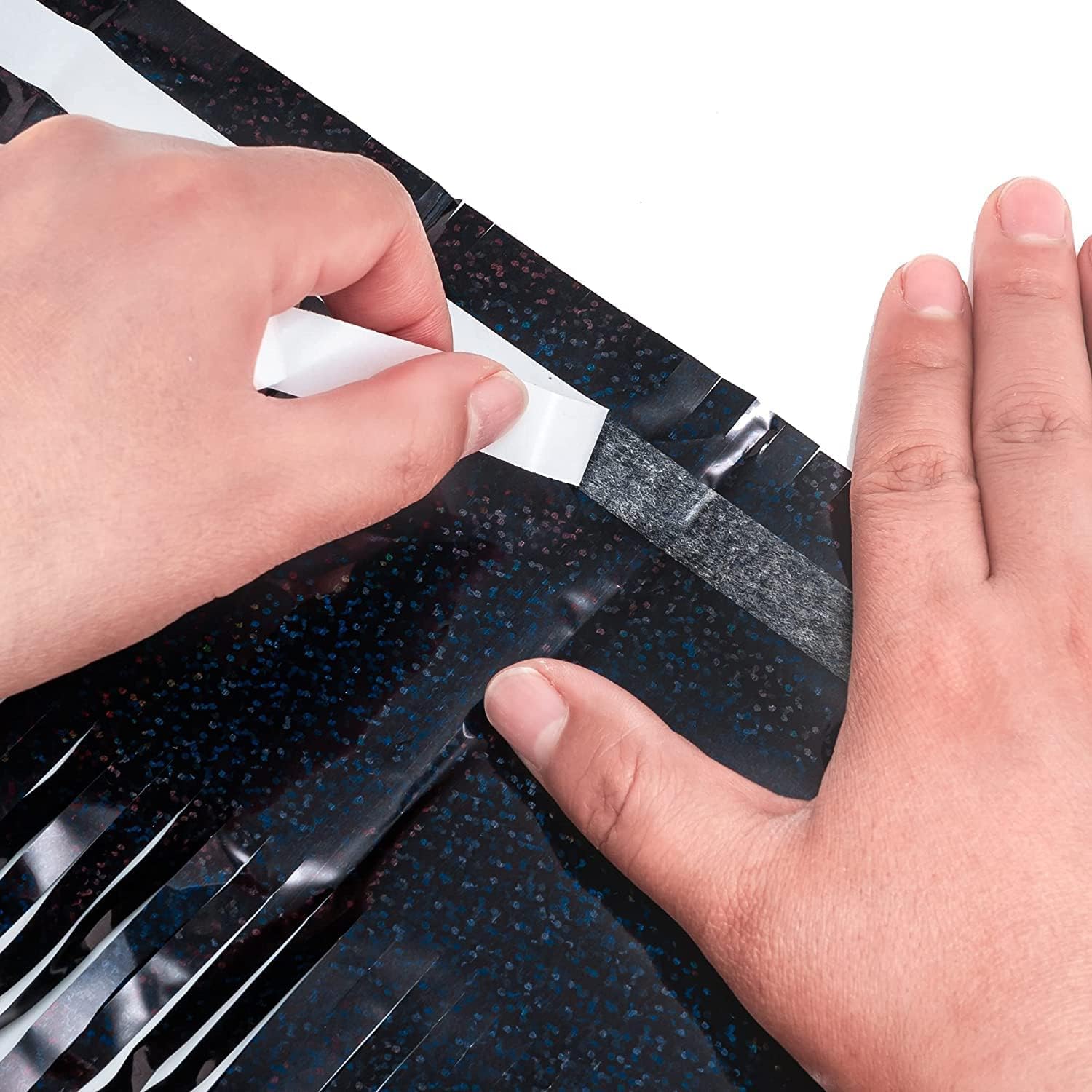 - The top of all wall streamers party curtains is covered with double-sided adhesive tape. No Push Pins or Tack Needed. With a sticky tape on the top so they are super easy to hang and stay up pretty well. Perfectly stay in place for the duration of indoor or outdoor event.