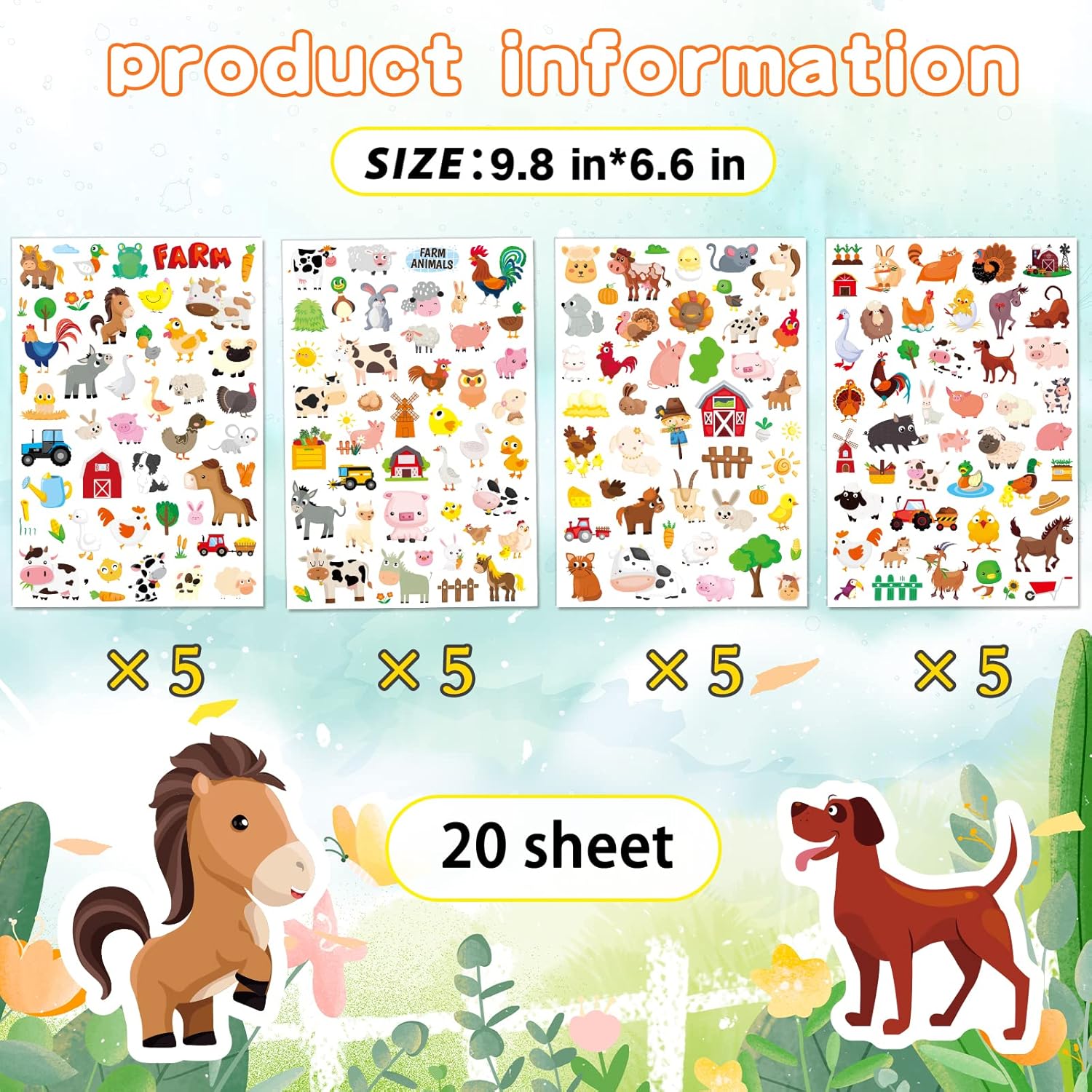 - FARM ANIMAL STICKERS KITS -- Each package of cute farm stickers kit is including 20 sheet of colorful farm animals like cow, sheep, dog, pig, horse and staffs stickers and each sheet have many farm stickers in different size and different designs. Totally 875 counts of stickers. Quite a lot of adhesive stickers for party favors, invitations decor, party goodie bags decor and scraping booking decor.