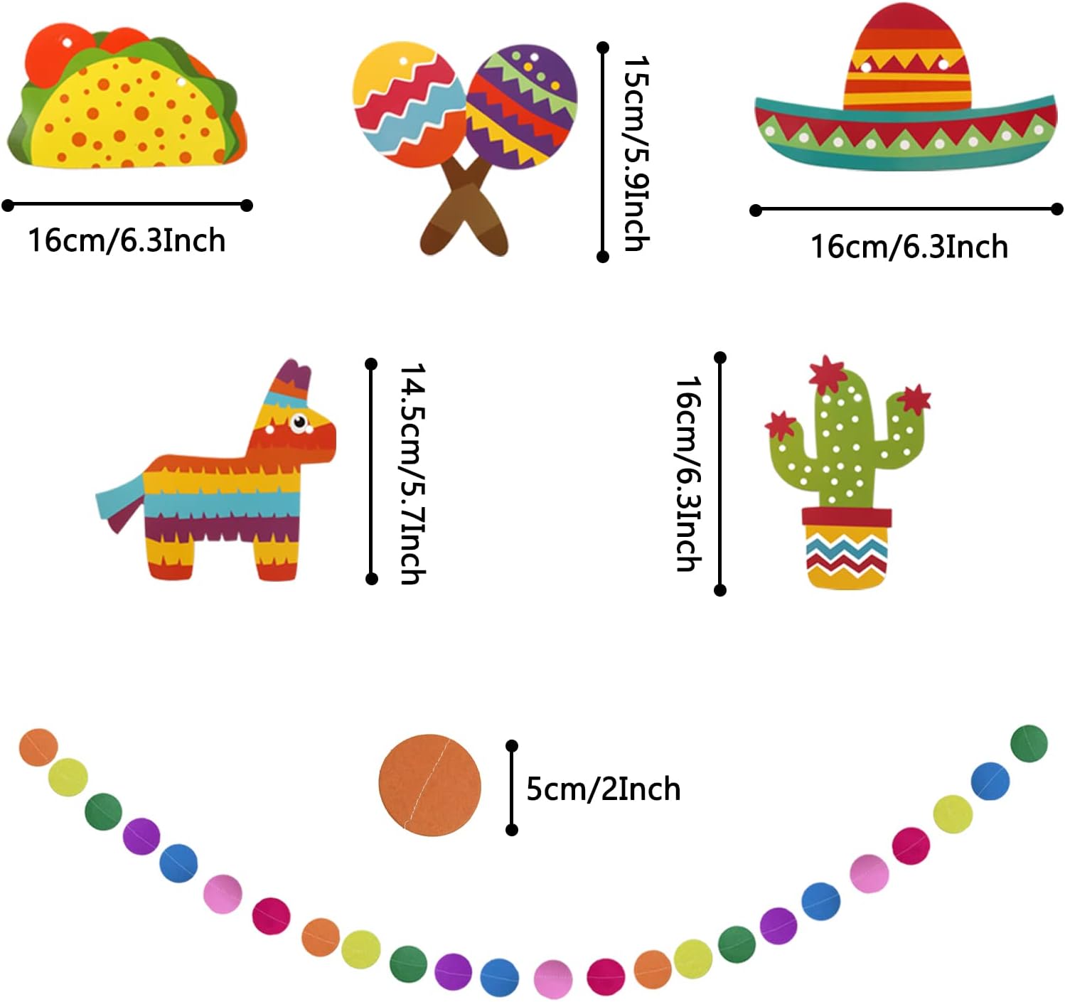 - Included Components : FIESTA Garland, Paper pompoms, Mexican Paper Fans, Paper hollow fans, Circle Paper Garland