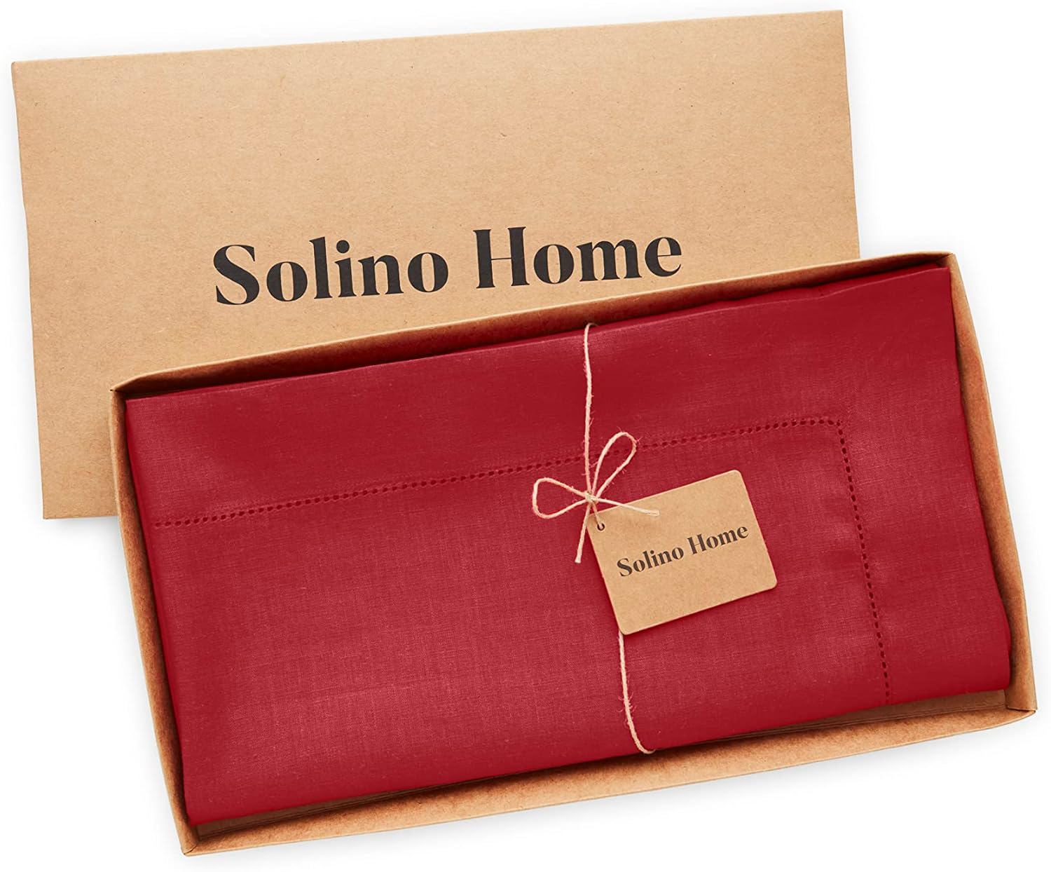 Solino Home Red Linen Tablecloth 52 x 52 Inch - 100% Pure Linen Square Table Throw - Classic Hemstitch, Machine Washable Table Cloth for Christmas
