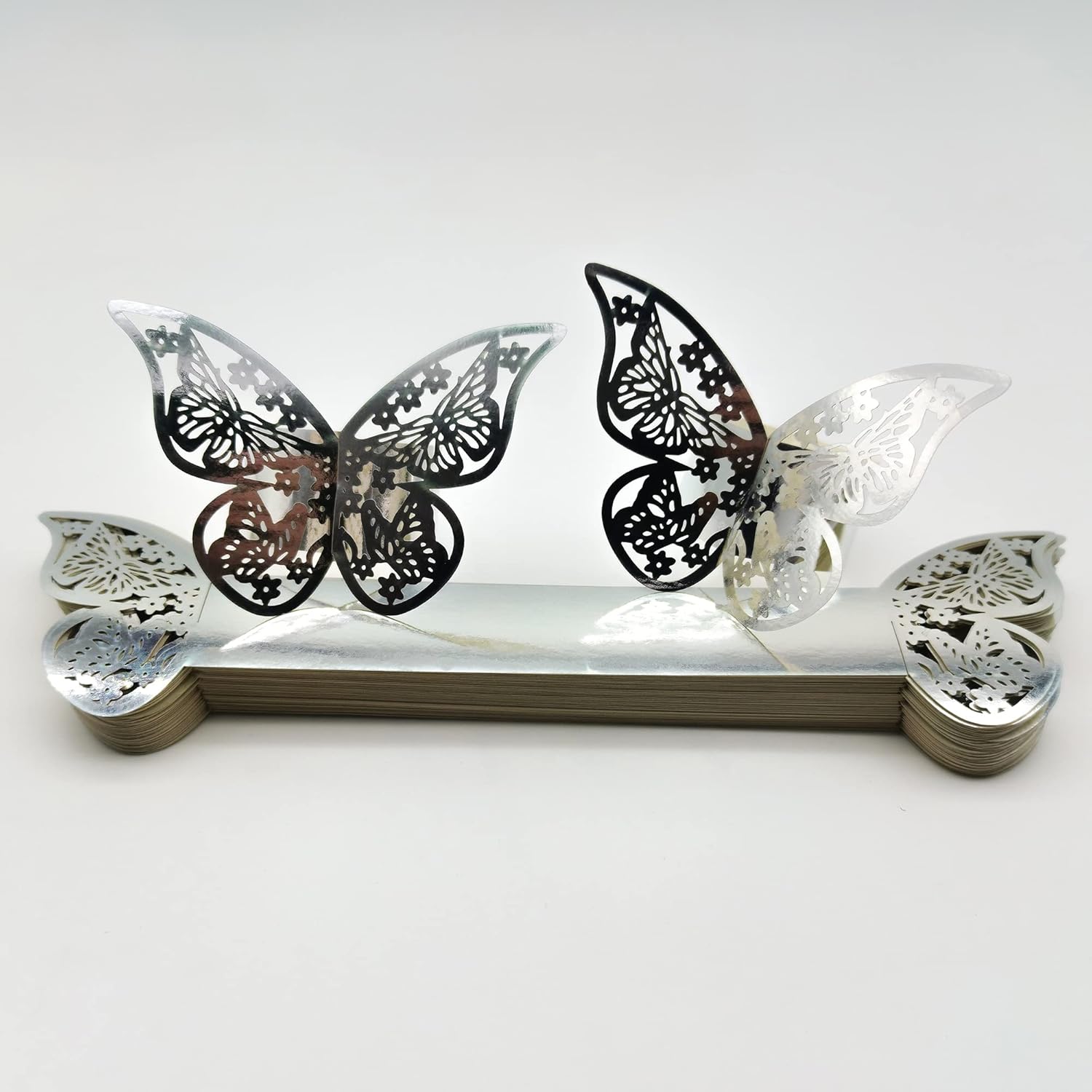 Butterfly Silver Paper Napkin Rings Set of 100 pcs,3D Laser Cut Foil Cutout Paper Napkins Holder,Disposable Serviette Rings for Tables,Decorations,Wedding,Dinner,Party Decor (Silver)