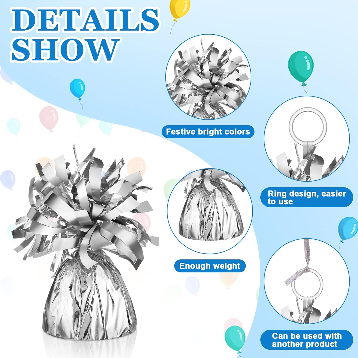 - Silver Theme Design: the silver string for balloons and the balloon weight are designed in bright silver, which can shine with different light sources, exquisite and delicate, helping enhance your holiday or party atmosphere