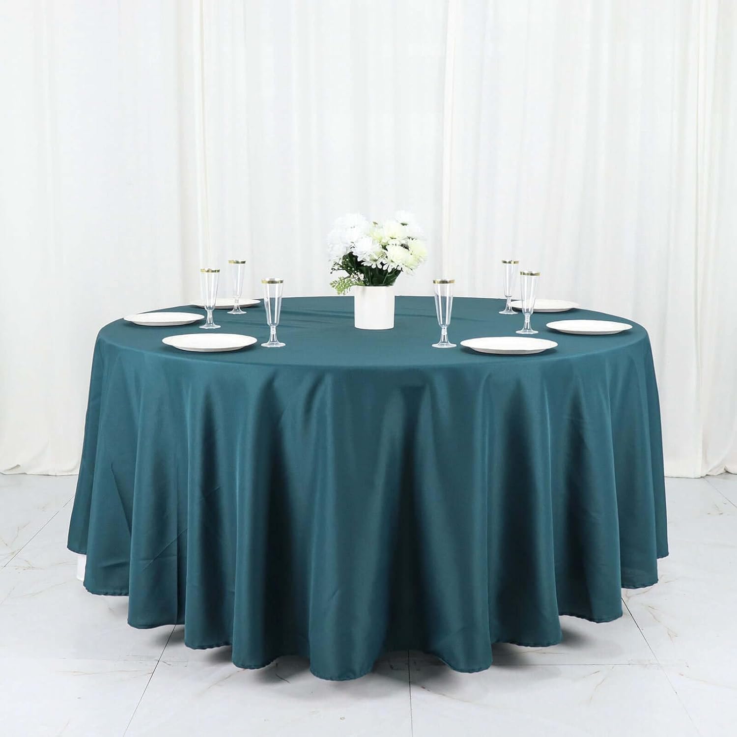 - Quantity: 1 Tablecloth Material: Polyester Color: Peacock Teal Size: 108" Round Thickness: 130 GSM 1 piece, seamless design. Features: Stain & Wrinkle Resistant, Machine Washable Hemmed edges for an exquisite look. Gives floor length hang on standard 4ft (48") tables.