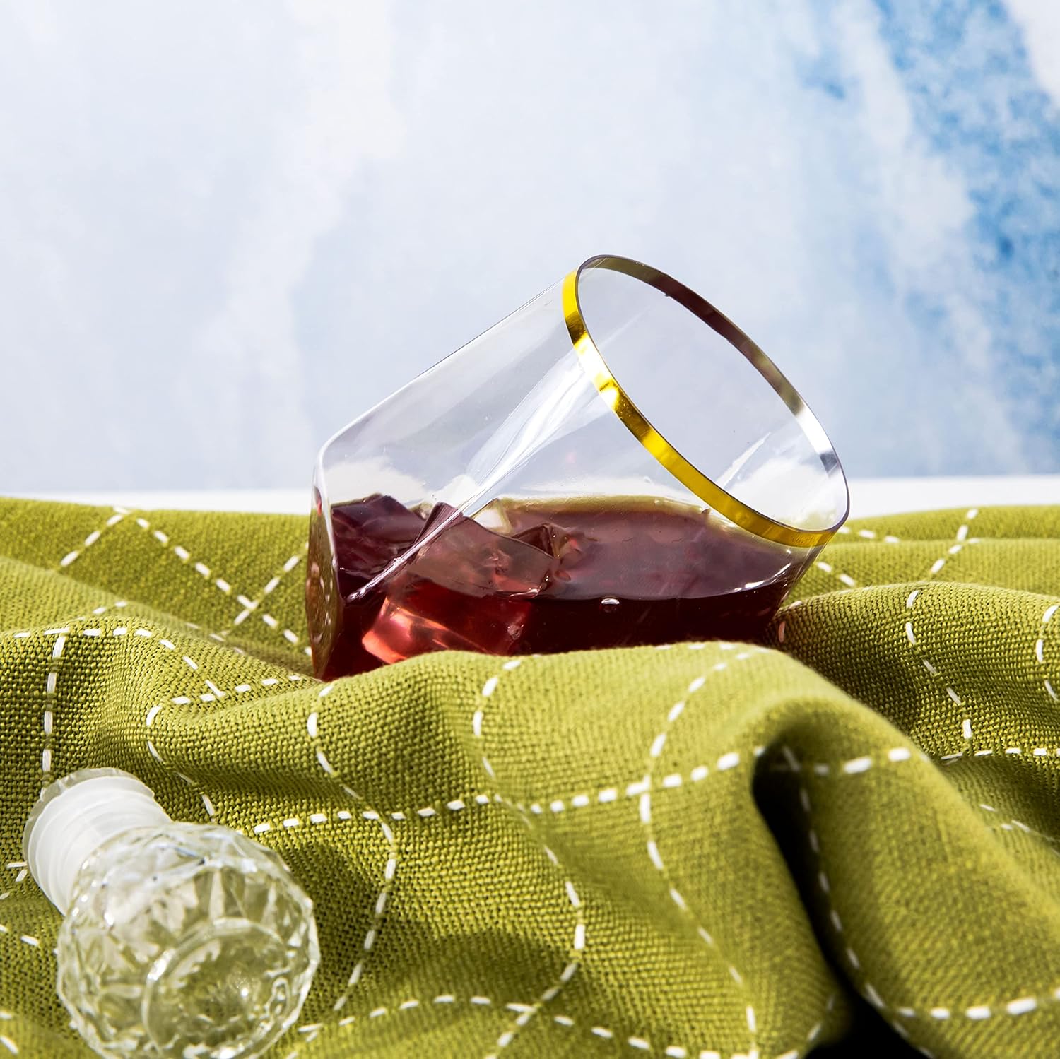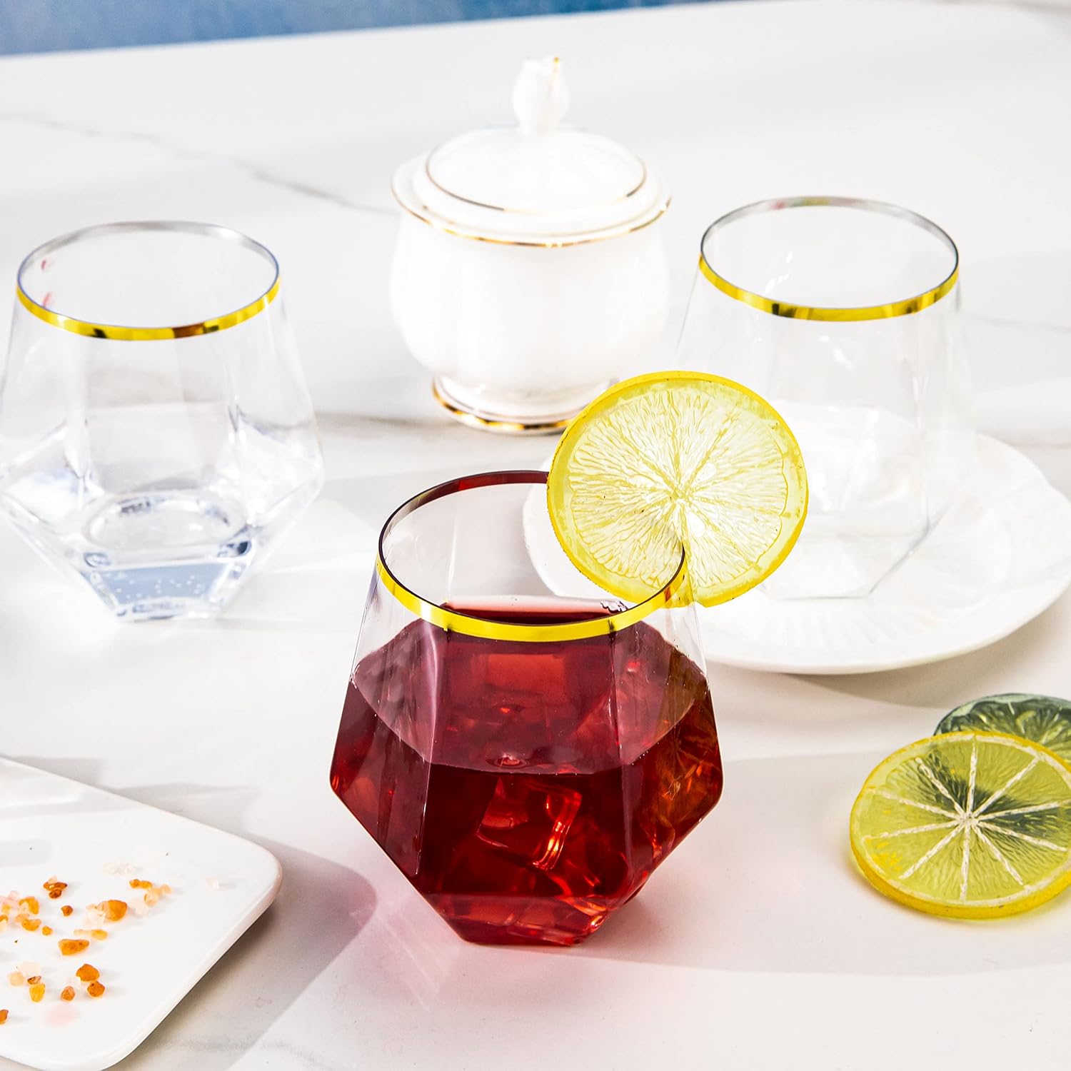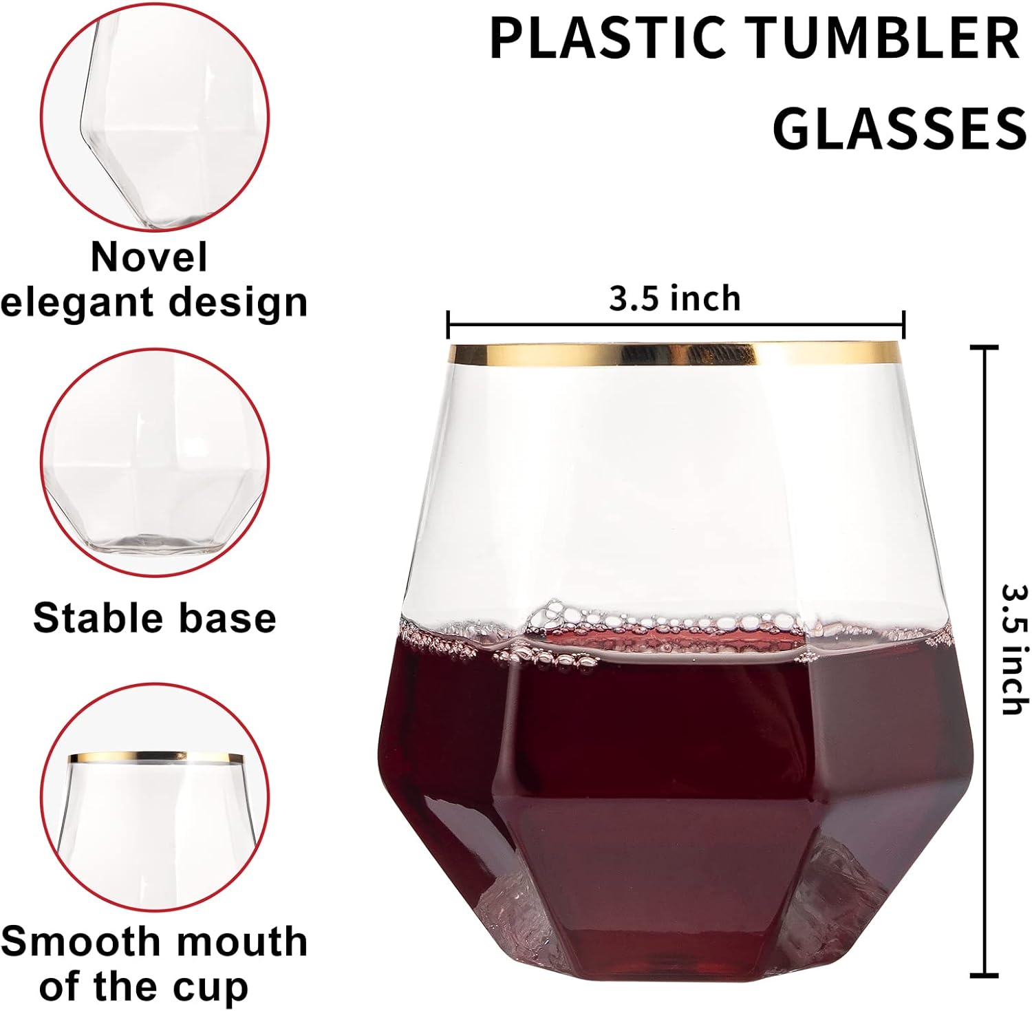 - FASHIONABLE AND EXQUISITE: The LUODA disposable stemless wine glasses have a gold rim and a diamond-shaped design that allows it to be placed on its side. The 12-ounce gold diamond plastic wine glasses can be paired with any color beverage and can add a sense of sophistication to any table setting.