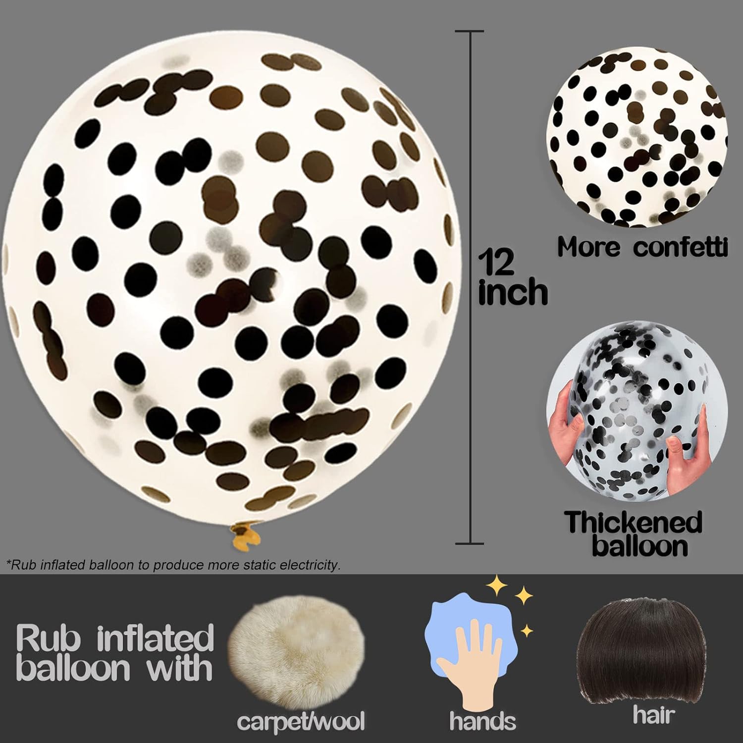 - How to Use: Before inflating the balloon, spray a little water into the balloon, so that the moisture helps the pieces of confetti stick to the balloon, rub the balloon with your hands or hair repeatedly to distribute them uniform inside the balloon