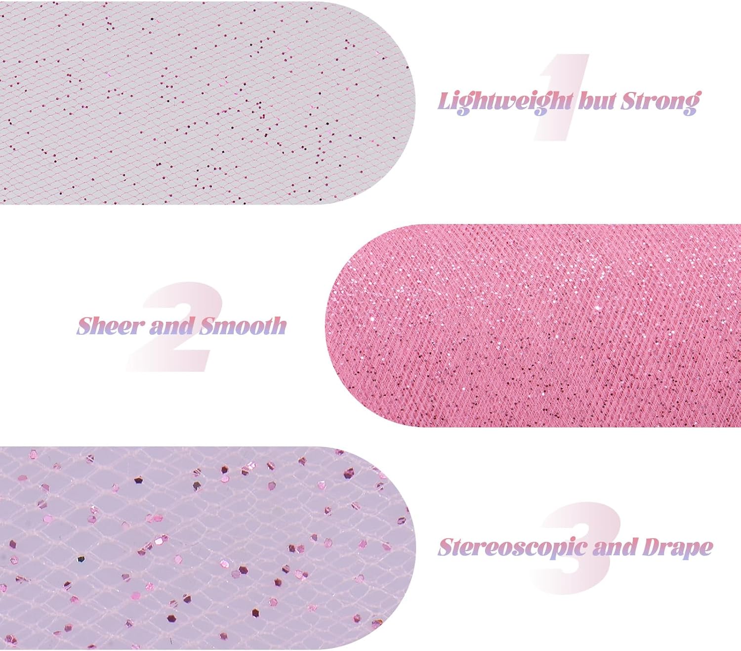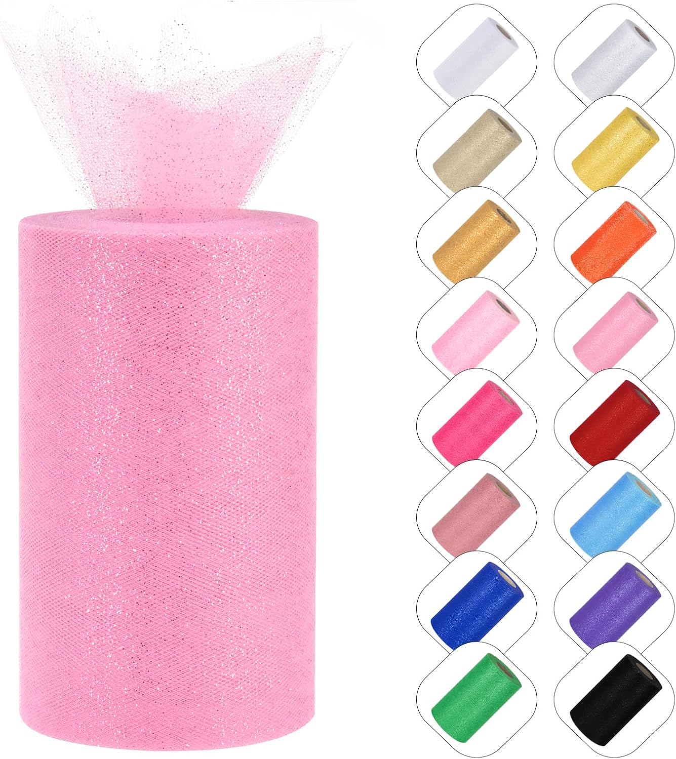 Glitter Tulle Rolls 6” by 50 Yards Sparkle Tulle Fabric Ribbon Sequin Tulle Netting Rolls for DIY Tutu Skirt Wedding Birthday Party Decoration (Pink)