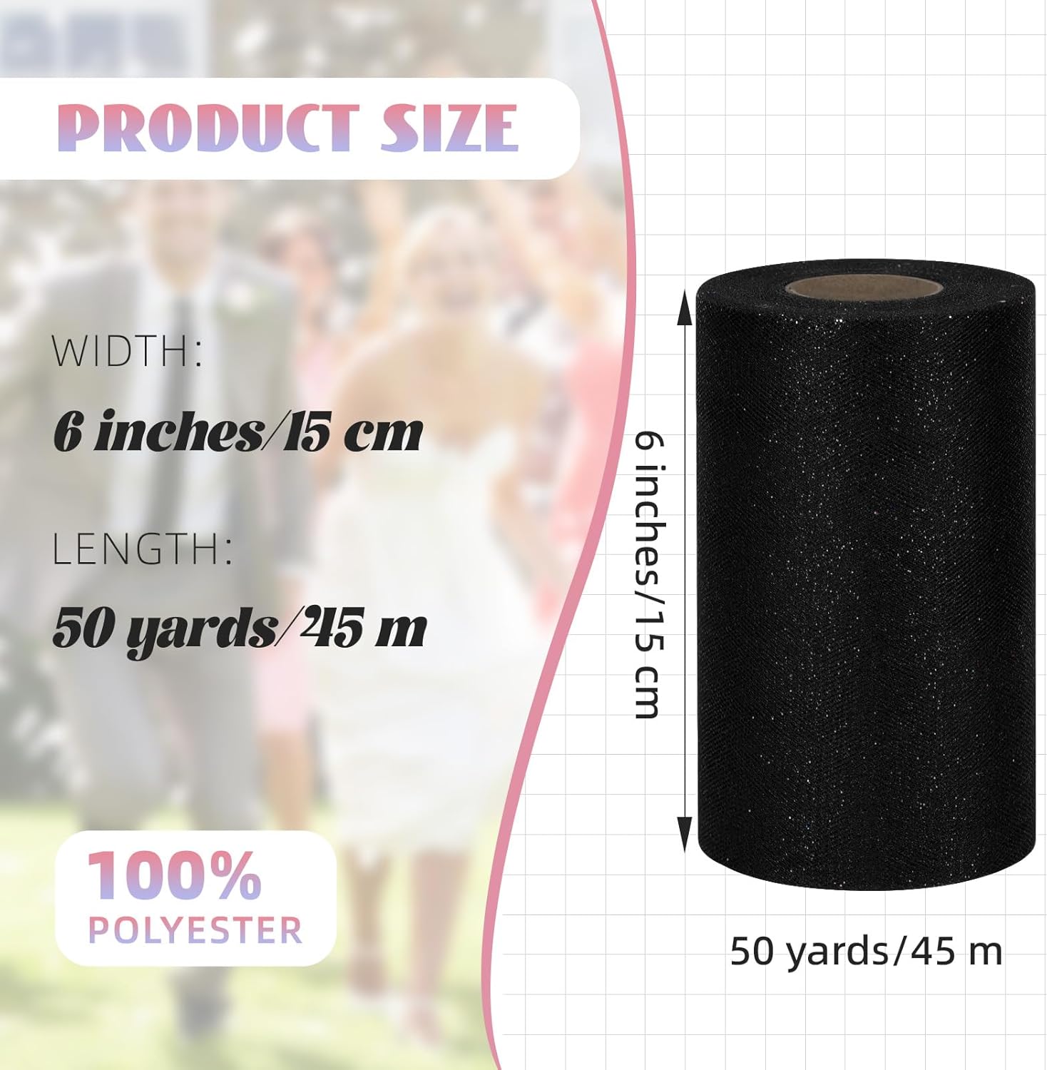 Glitter Tulle Rolls 6” by 50 Yards Sparkle Tulle Fabric Ribbon Sequin Tulle Netting Rolls for DIY Tutu Skirt Wedding Birthday Party Decoration (Black)
