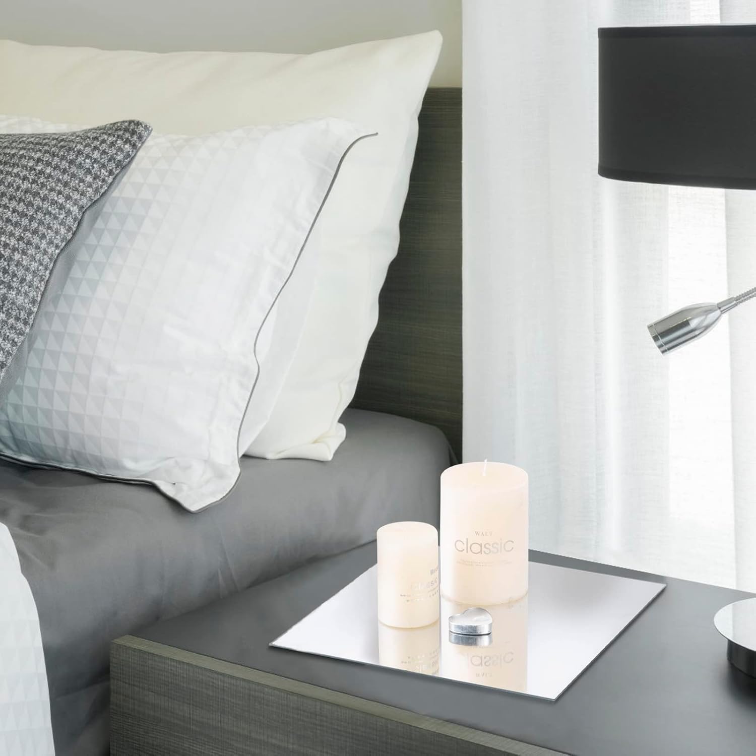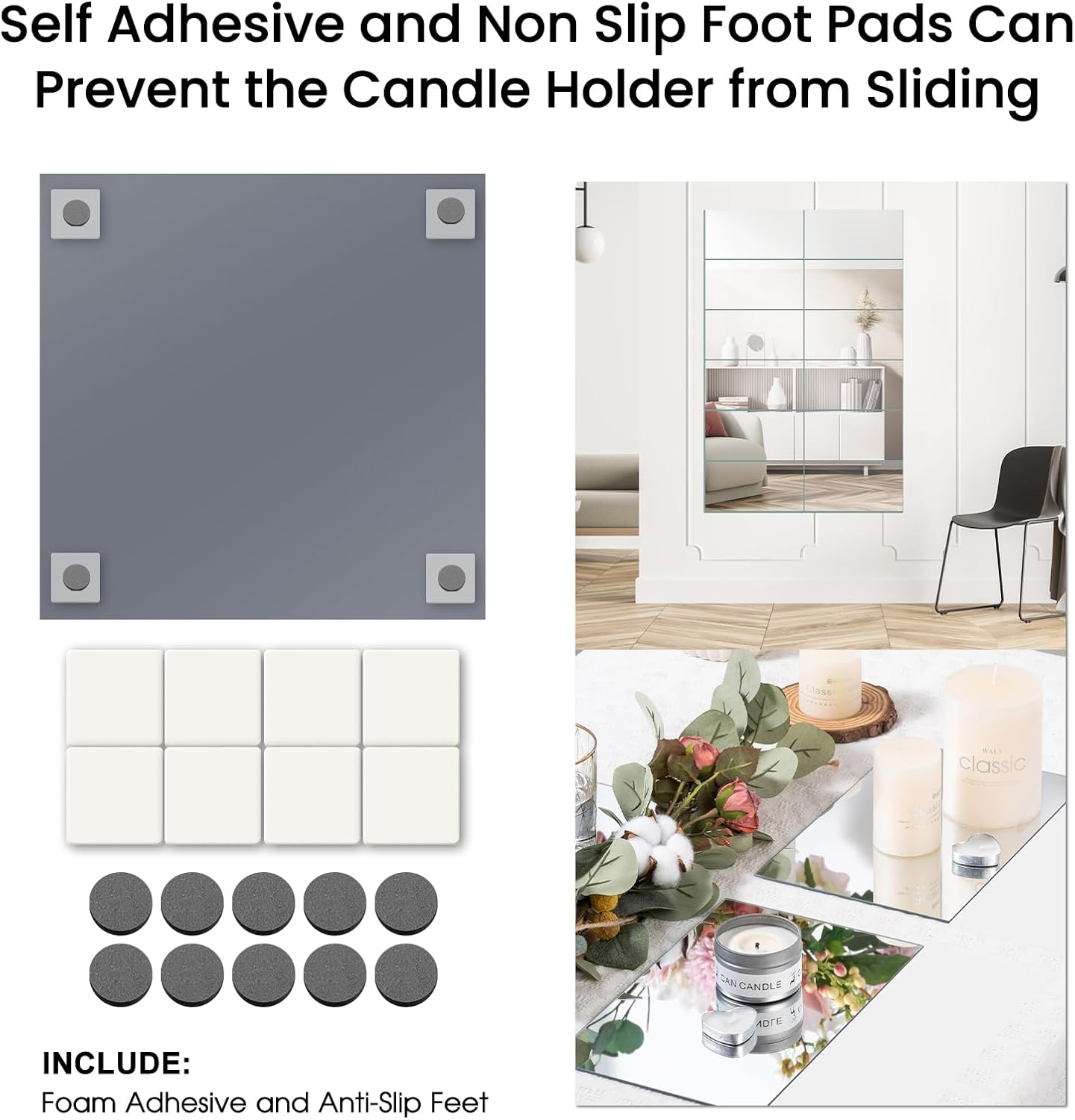 - 🎇Safe and Convenient : The elegantly rounded edges of our square mirror tiles not only enhance their aesthetic appeal but also ensure safety during handling. The cushioned non slip feet on the back of each mirror candle plate prevent scratches on the table surface, providing added convenience and peace of mind.