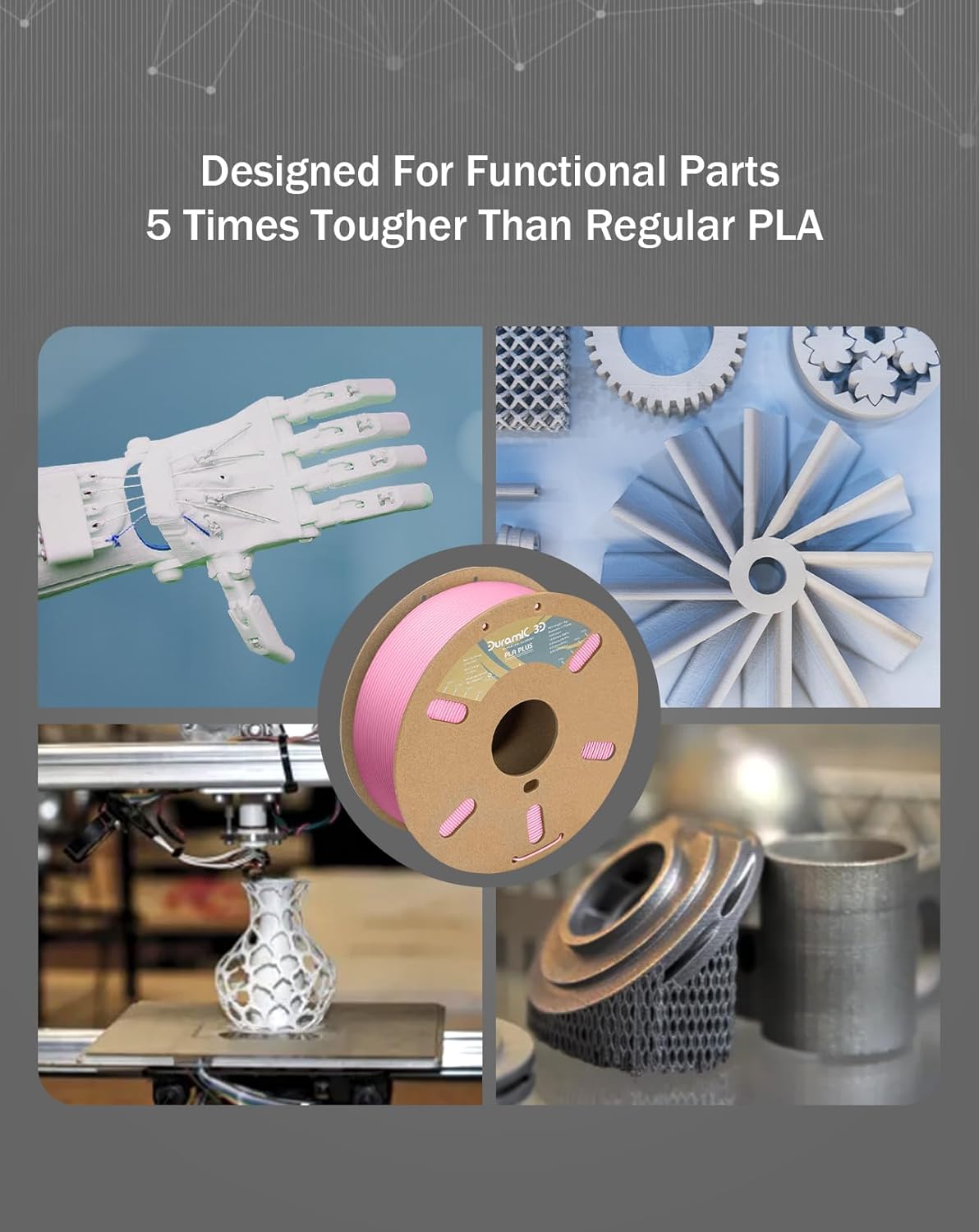 - 【Higher Impact Strength & Toughness】 PLA Plus known as the flagship product of Duramic 3D, PLA Plus filaments (PLA+) 1.75mm are made of USA high-purity raw material from Natureworks. Duramic 3D PLA Pro filaments feature 5 times impact strength , which is perfect for printing functional models with higher toughness need.