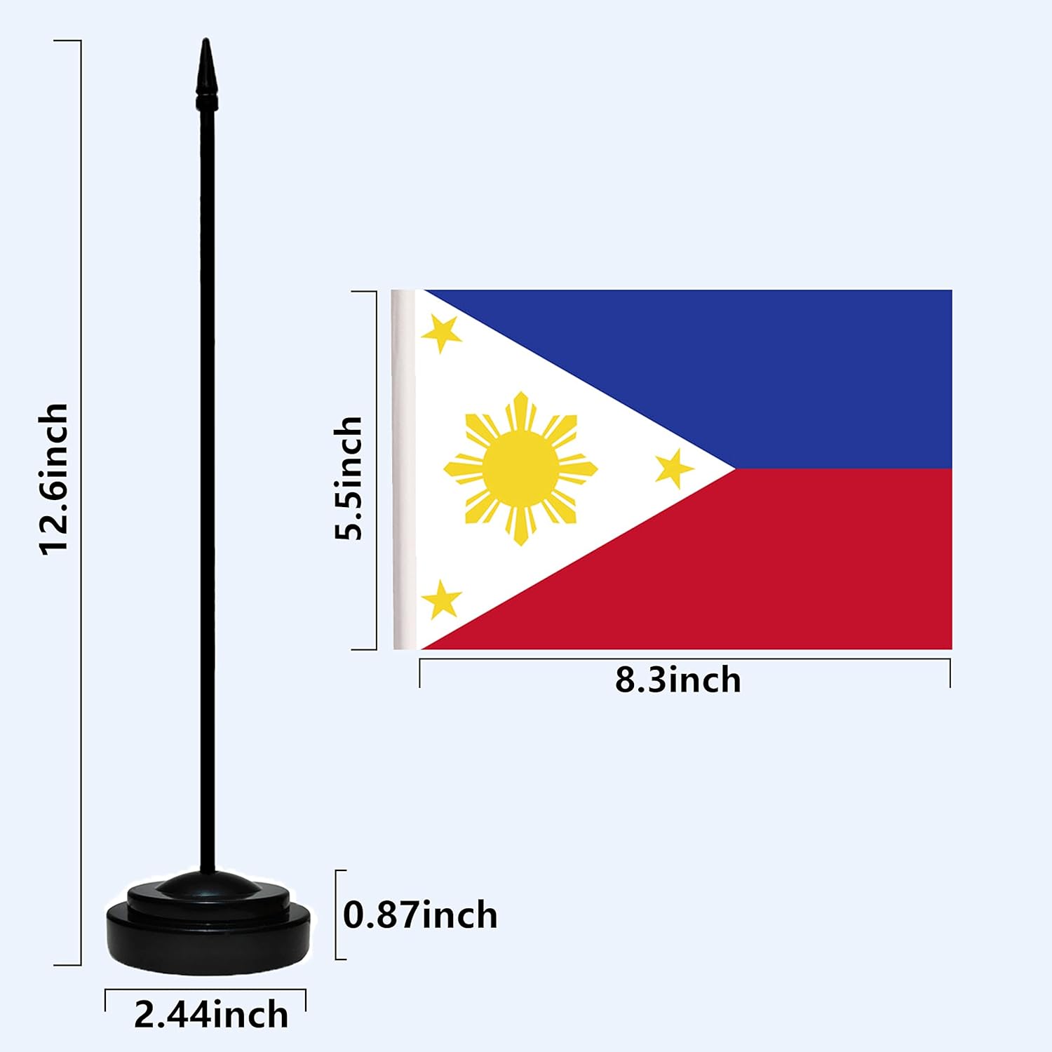 - Speciflcation: plastic flag base:13 inches tall; flag size:8.2" x 5.5"(W xL).Quantity: 2 pack Philippines Filipino Miniature Deluxe Table flags.