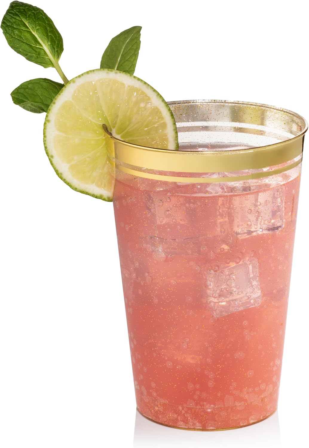 Perfect Settings 100 Premium 12oz Hard Plastic Cups Clear Glitter Gold Plastic Double Colored Rimmed Cups Fancy Disposable Wedding Cups Elegant Party Cups with Twin Colored Rim (Glitter Gold Rim, 12)