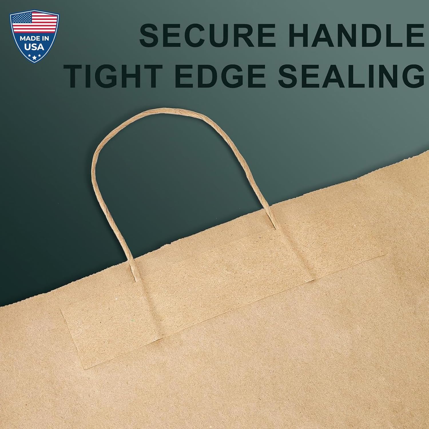 - Premium Kraft Paper Bags:These sturdy brown paper bags are made of 100g weight paper, can holding up to 8 lbs. The paper bags with comfortable and strong handles,neat wavy edge prevent your hands being scratched,.The reinforced bottom also provides extra support while you carry items, ensuring that the contents will stay safe not fall through.