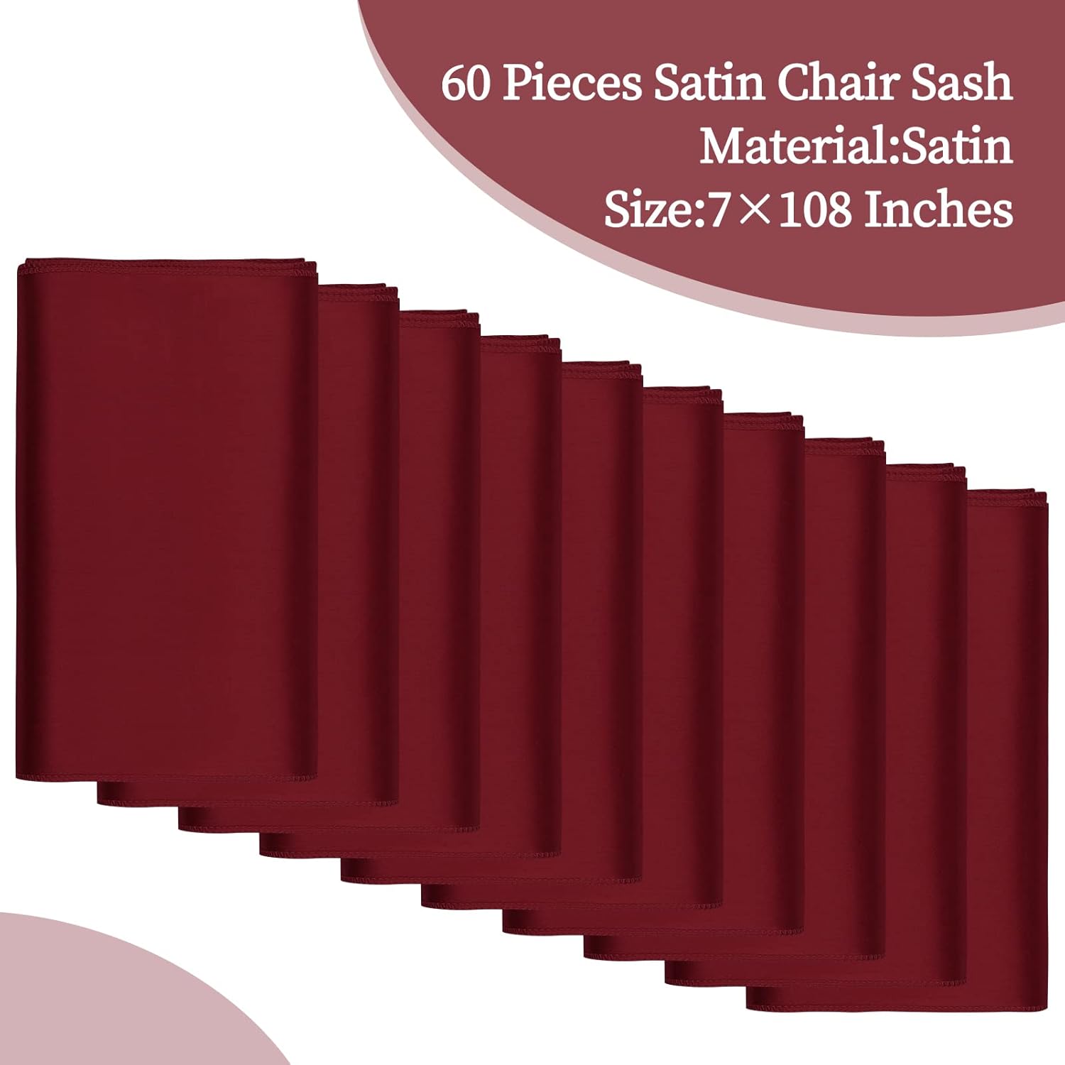 - 🍒【Package Include】Pack of 60 satin chair sash.Size: about 7" x108" or 275cm(l) x 17cm(w). Each package includes chair sashes only, without chair covers.These chair ties bring a modern twist to your chair's settings and let your chairs sparkle brightly. Satin sashes can be tied into wedding chairs, draped across any decoration, or used as attractive table runners.