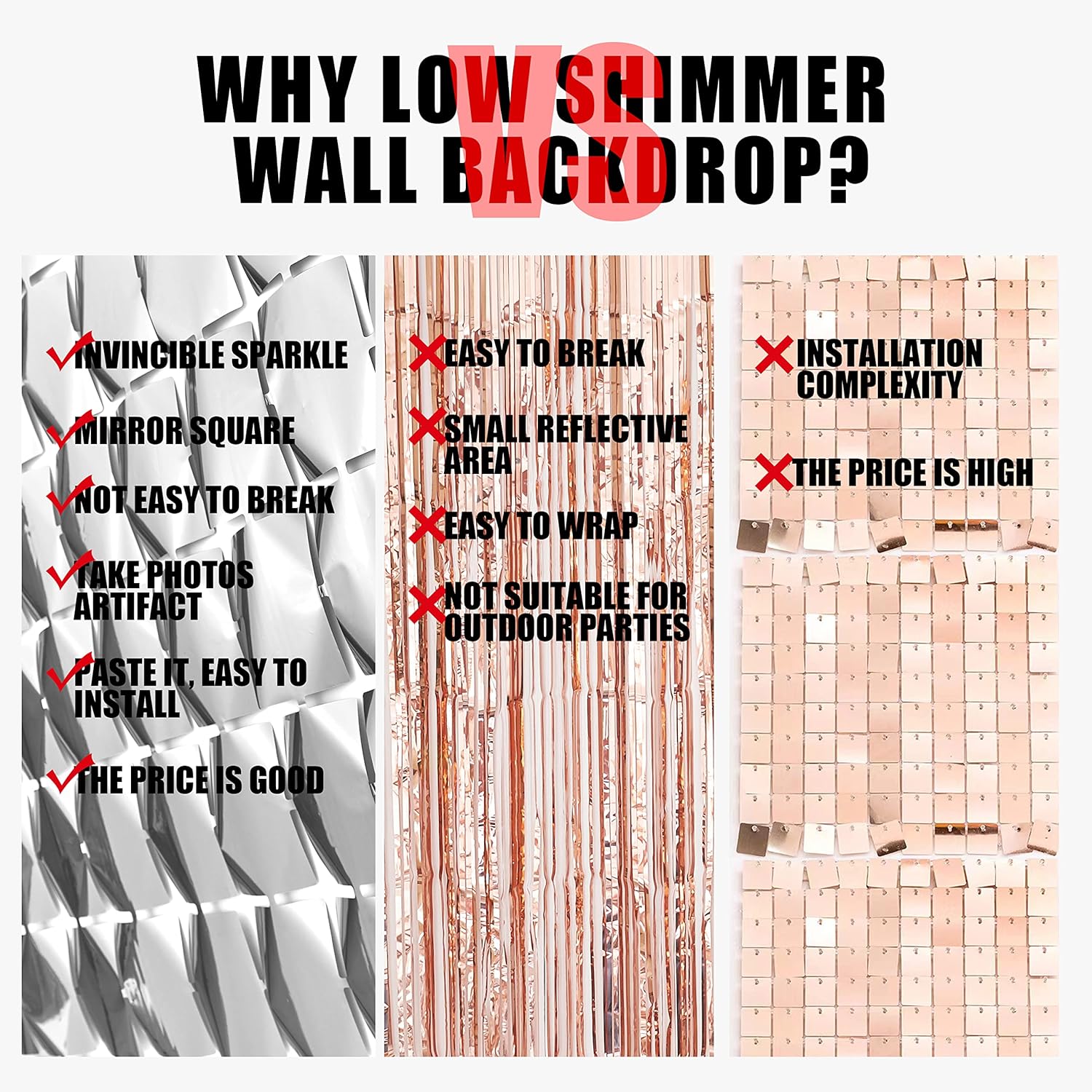 - EASY TO USE: This square backdrop curtain comes with double sided tape on the back of them, what you need to do is just gently take it out of the package, peel plastic strip off and paste or hang them on a smooth surfaces. When the party is over, you could remove them for your second use.