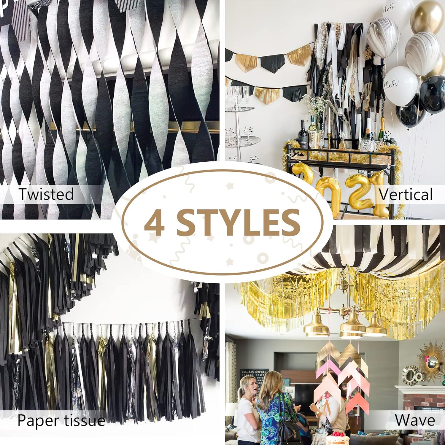 PartyWoo Crepe Paper Streamers 4 Rolls 328ft, Pack of Black and Gold Crepe Paper for Party, Wedding, Birthday, New Year's Eve Decorations (1.8 Inch x 82 Ft/Roll)