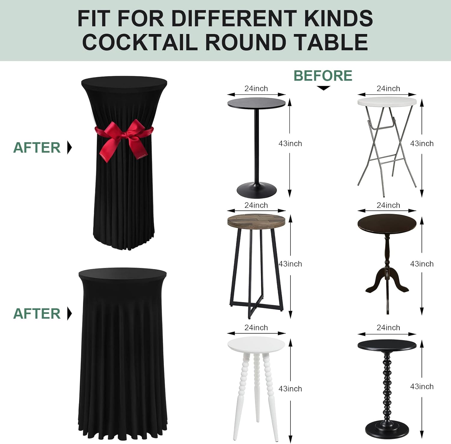 - Skirt Design - These are uniquely designed cocktail table covers that fit any tall round table with a diameter of approximately 24 inches and a height of approximately 43 inches, whether the bottom is an X style or a single center column