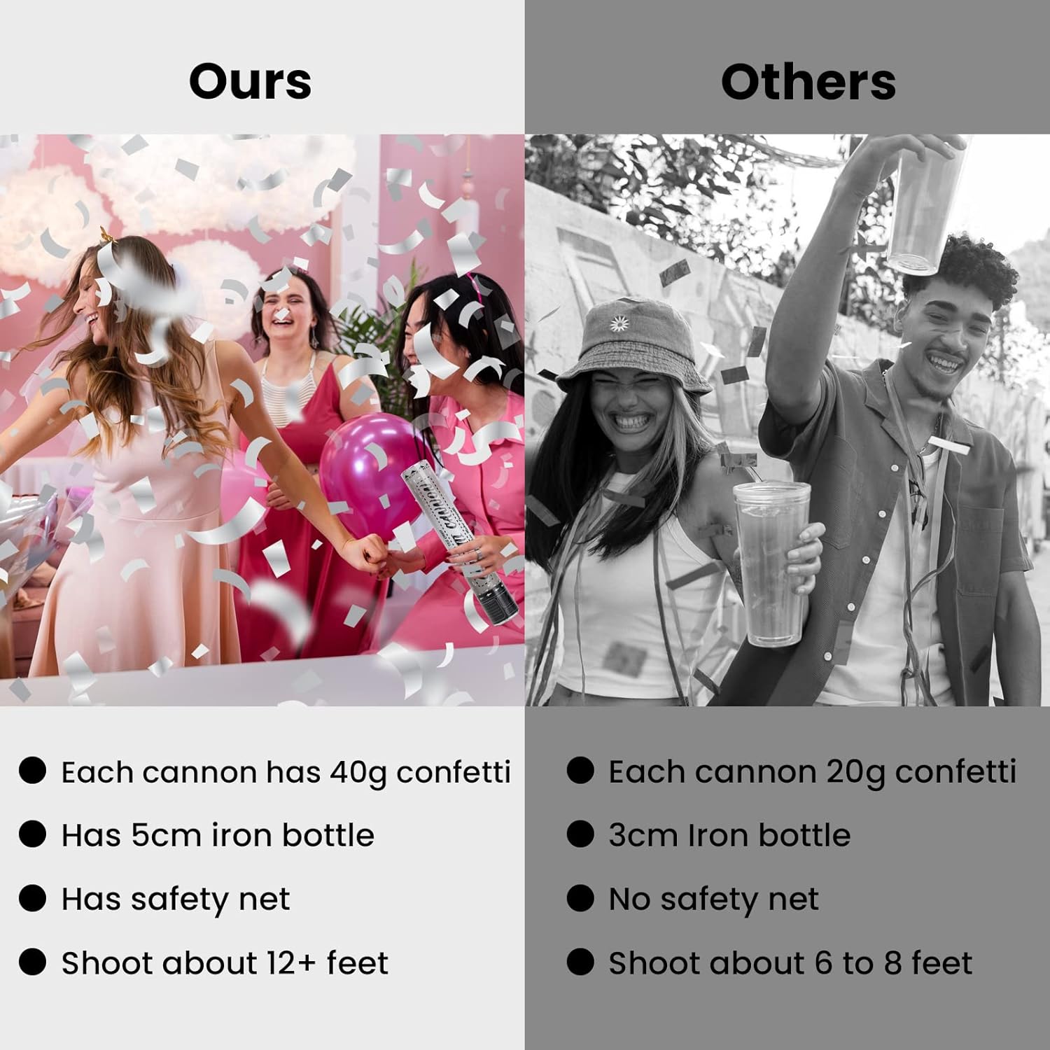 - π Add Some Extra Oomph To Your Party: There is nothing more disappointing than a weak confetti blaster with a poor trajectory. Our party confetti popper has a shooting range of over 12 feet and can send the confetti up to 20 feet in the air!