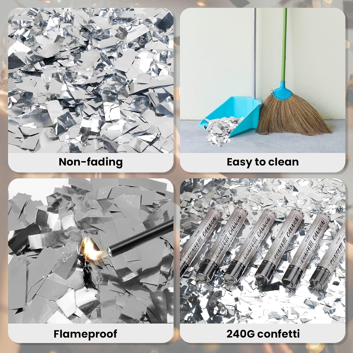 - π Get Ready For Silver Confetti Magic In The Air: Shower your guests with silver party confetti, or silver wedding confetti. Our air popper party cannon is filled with silver metallic confetti made of non-fade and fireproof mylar - the best party confetti!