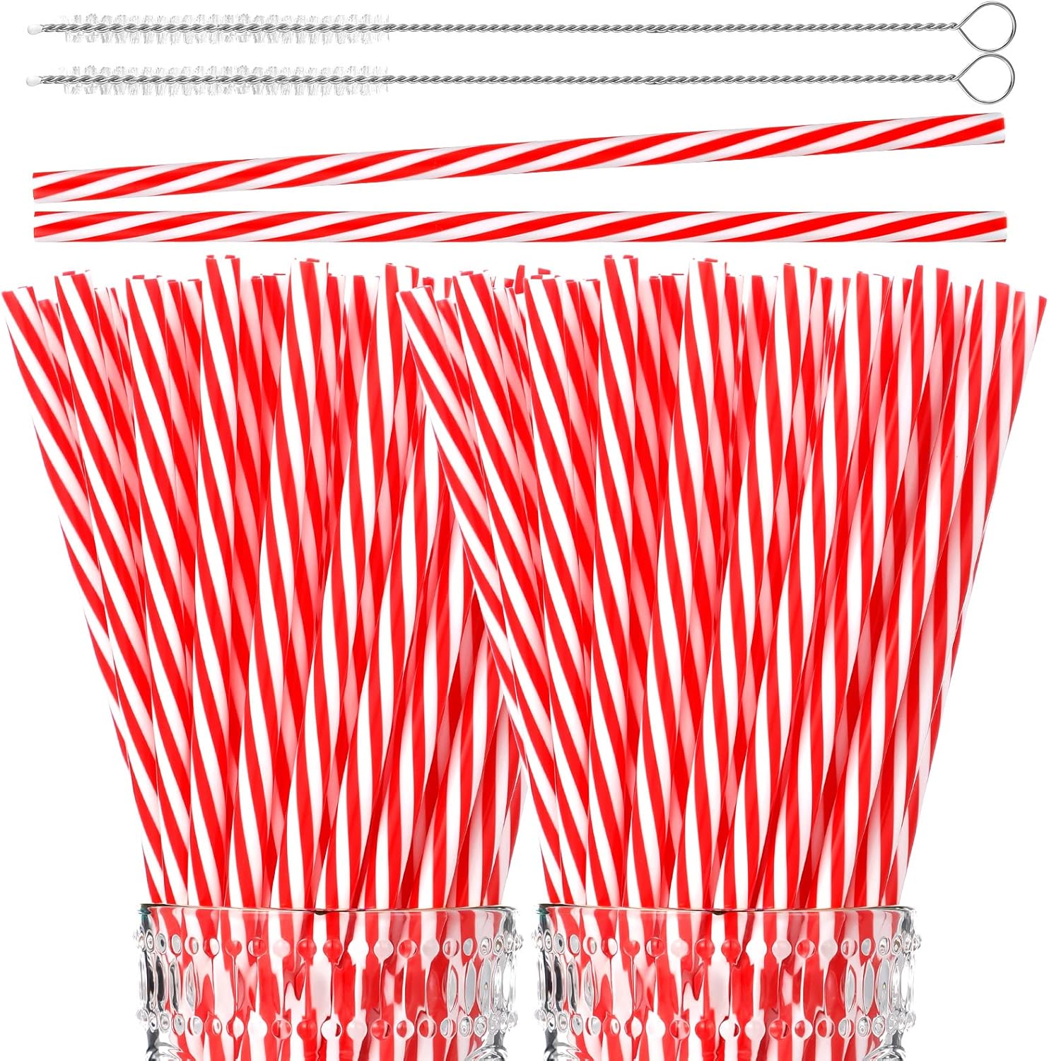 Vesici 9 Inch Plastic Striped Straws Reusable with Cleaning Brush Red Striped Hard Drinking Straws for Christmas Party Decoration Supplies(Red and White,102 Pcs)